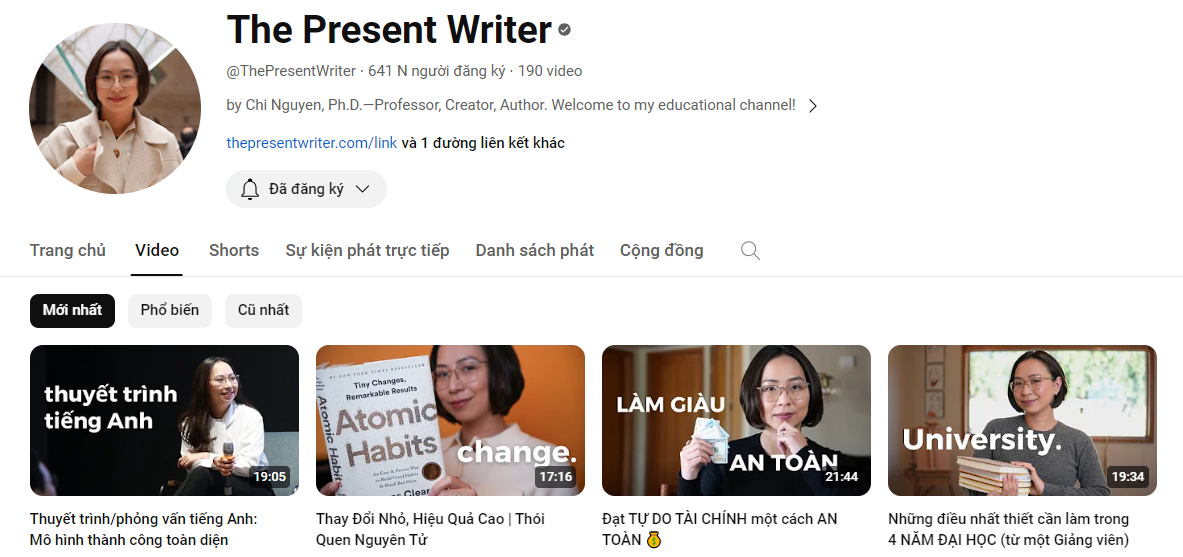 Kênh YouTube The Present Writer là sản phẩm của tiến sĩ giáo dục tại Mỹ - Chi Nguyễn. Cũng chính vì vậy mà những nội dung có trên The Present Writer đều có nền tảng khoa học nhất định, vừa có tính ứng dụng cao, vừa hiệu quả.