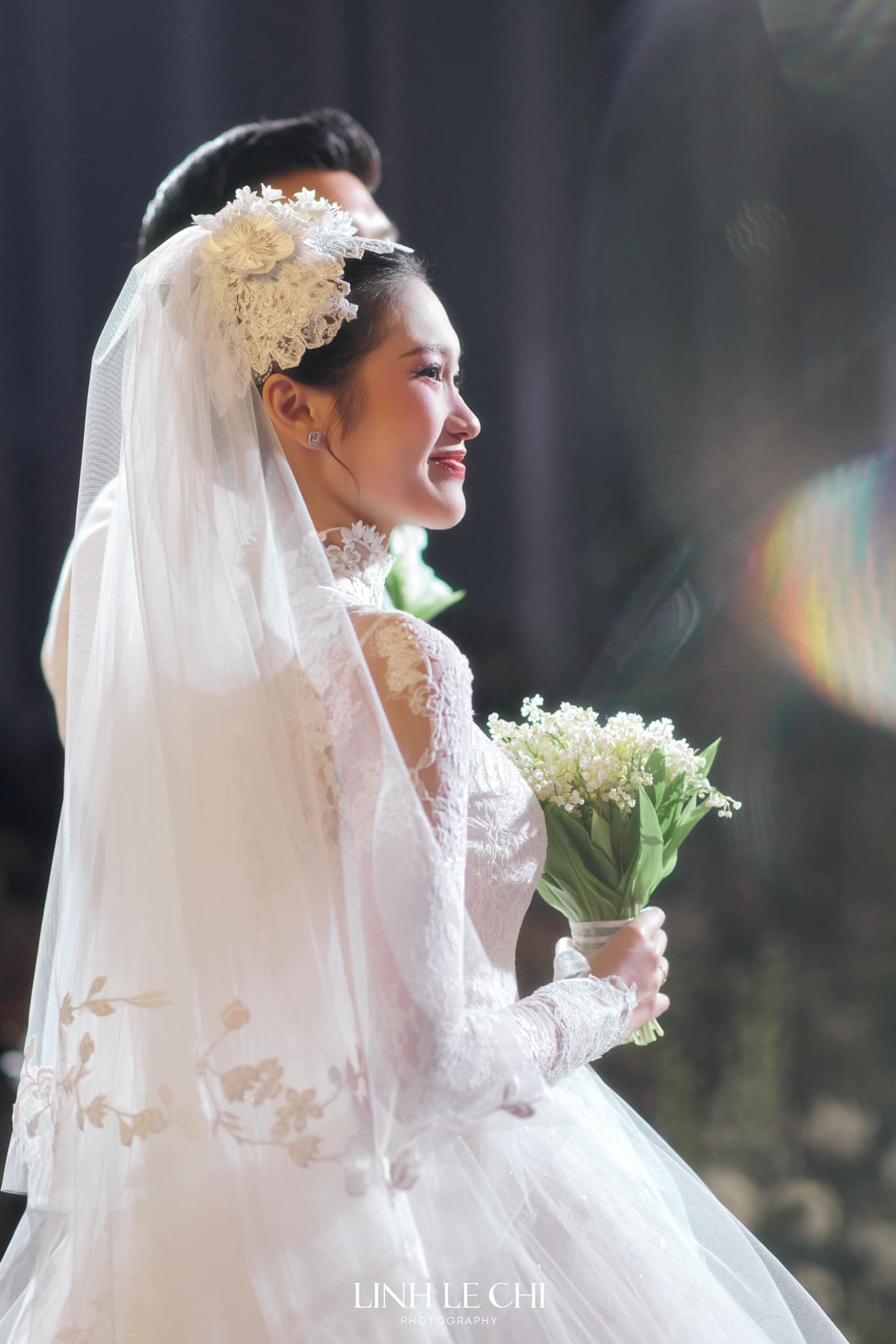 Doãn Hải My mặc một bộ váy cưới dáng quả chuông, tay dài cổ cao cực kỳ kín đáo. Tuy nhiên, chất liệu ren giúp cô dâu nhìn vẫn thanh lịch, sang trọng chứ không bị cảm giác bức bí, kín cổng cao tường.