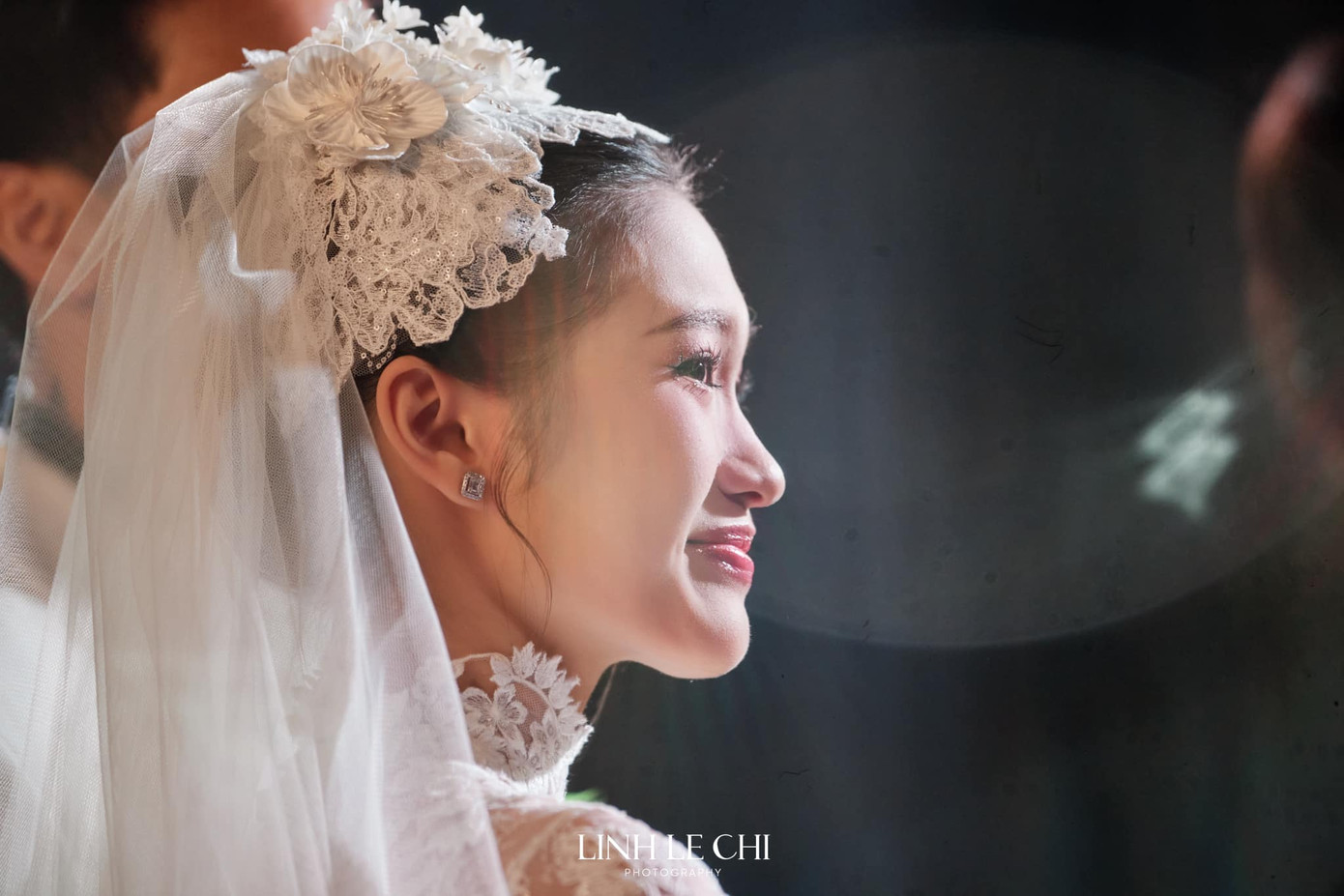 Bà xã của Đoàn Văn Hậu cũng chăm chút vào voan đội đầu. Không chỉ là khăn voan thướt tha mà Doãn Hải My còn kèm thêm mũ đội được đính kết hàng chục bông hoa vải rất tinh xảo.