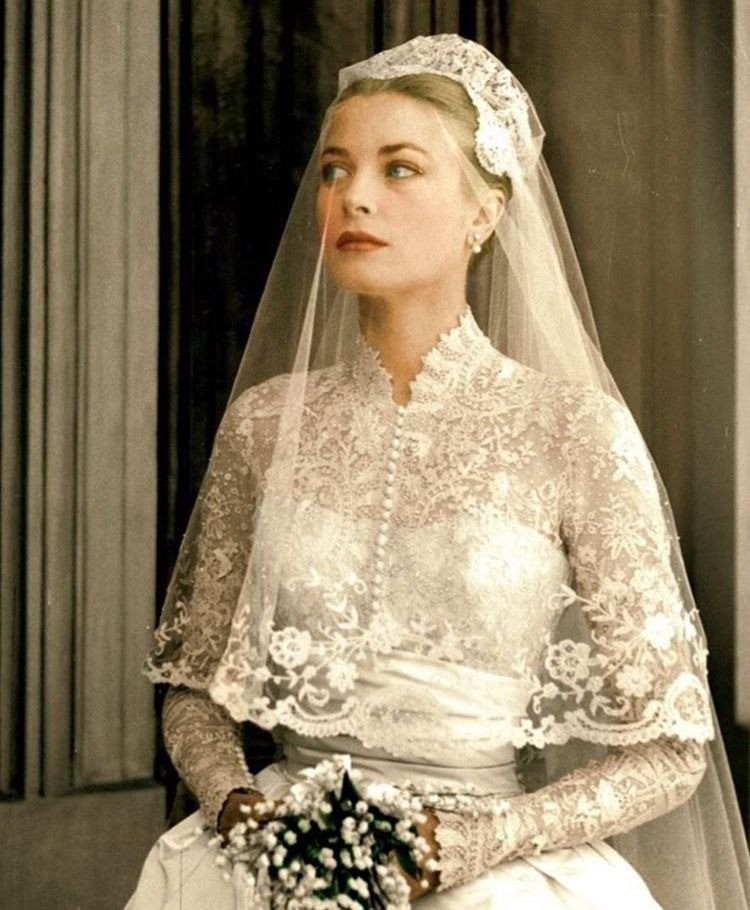 Bộ váy cưới ren đầy kín đáo, thanh lịch cùng với voan đội đầu độc đáo mà Grace Kelly mặc trong ngày cưới được xem là một trong những mẫu váy cưới kinh điển của thế giới cho đến tận bây giờ, rất được các cô dâu yêu thích.