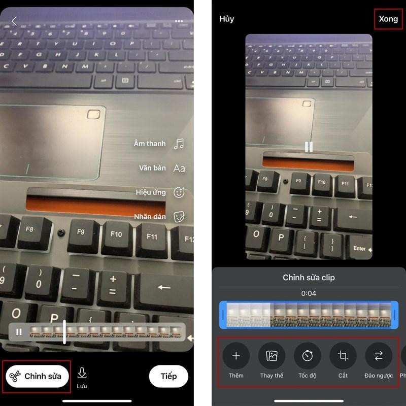 Bước 7: Khi đã có video, bạn có thể nhấn Chỉnh sửa > Tại đây, người dùng có thể điều chỉnh Thêm, Thay thế, Tốc độ, Cắt, Đảo ngược hay Phản chiếu > Nhấn Xong để hoàn tất video.