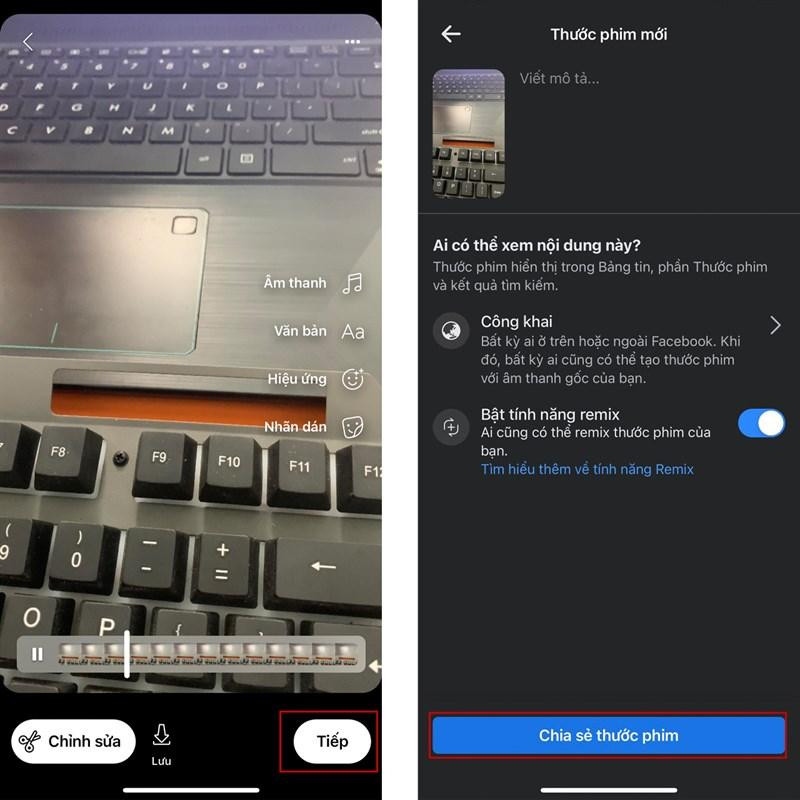 Bước 8: Nhấn Tiếp > Nhấn Chia sẻ thước phim để đăng video ngắn mà bạn vừa tạo nhé.