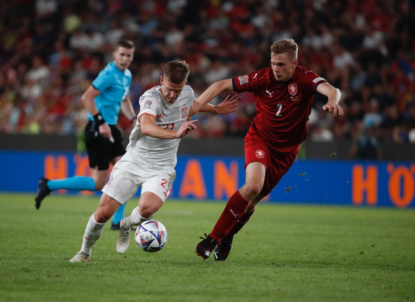 Ngay phút thứ 4, mành lưới Tây Ban Nha đã rung lên khi Carvajal mất tập trung, tạo điều kiện cho Kuchta phá bẫy việt vị trước khi đánh bại thủ môn Simon trong pha đối mặt. Nhận bàn thua từ rất sớm nhưng La Roja cũng không cho thấy quyết tâm cải thiện tình hình.