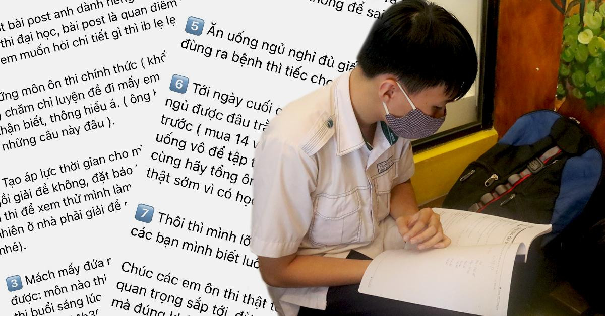 “Trước khi làm bài, cần hít thật sâu, thở đều để lấy bình tĩnh. Nhớ uống đủ nước để đảm bảo sức khỏe, tư duy thông suốt. Nhận đề rồi thì nên đọc kĩ, kiểm tra đề có mờ hay thiếu trang không. Chú ý dễ làm trước khó làm sau, cẩn thận đừng làm sót”, thầy Ba nhắn nhủ và khuyên sĩ tử thi xong môn nào bỏ môn đó qua một bên, không xem đáp án để tránh bị ảnh hưởng tâm lý.