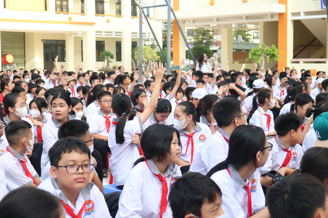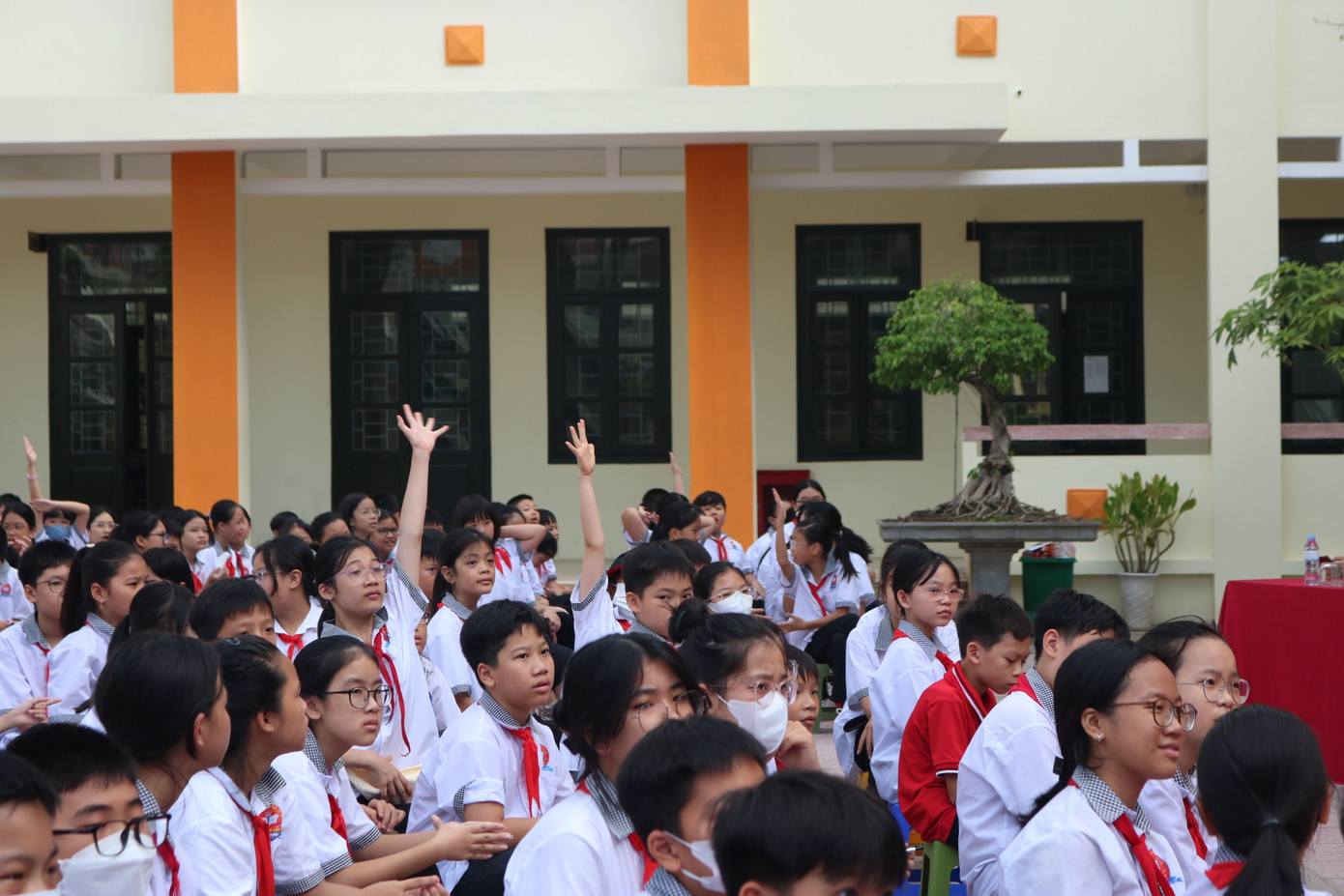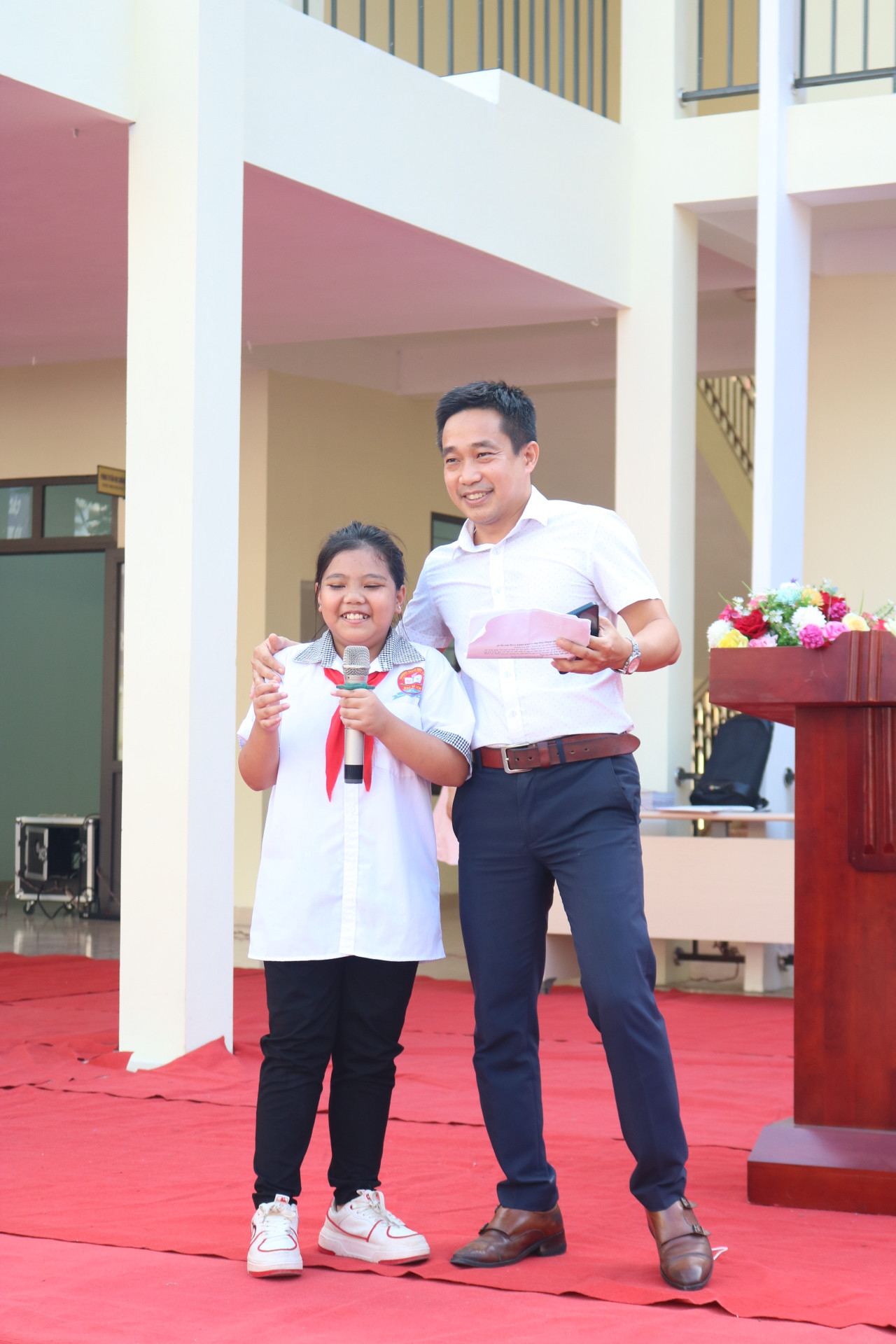 | Cô Huyền Trang - Tổng phụ trách Đội của trường giúp các bạn tham gia phần mini game rinh giải thưởng. |