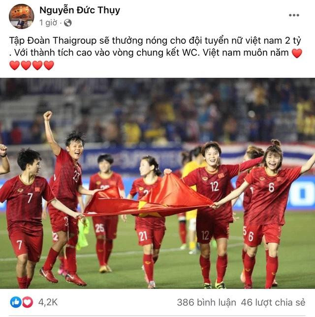 "Tập Đoàn Thaigroup sẽ thưởng nóng cho đội tuyển nữ Việt Nam 2 tỷ. Với thành tích cao vào vòng chung kết WC. Việt Nam muôn năm", doanh nhân Nguyễn Đức Thuỵ viết trên Facebook cá nhân. Thông tin này ngay lập tức nhận được nhiều sự quan tâm, ủng hộ của công chúng.