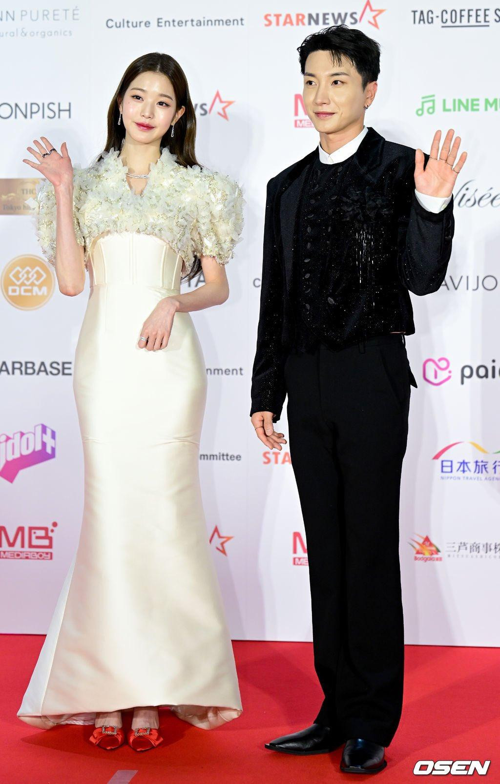 Tuy nhiên, sự "lạc quẻ" của Won Young có thể du di được, vì cô nàng còn đi thảm đỏ với tư cách MC. Dù không ăn nhập khi đứng cạnh các thành viên, nhưng chiếc váy này lại tôn dáng và phù hợp khi Won Young đi cùng Leeteuk.