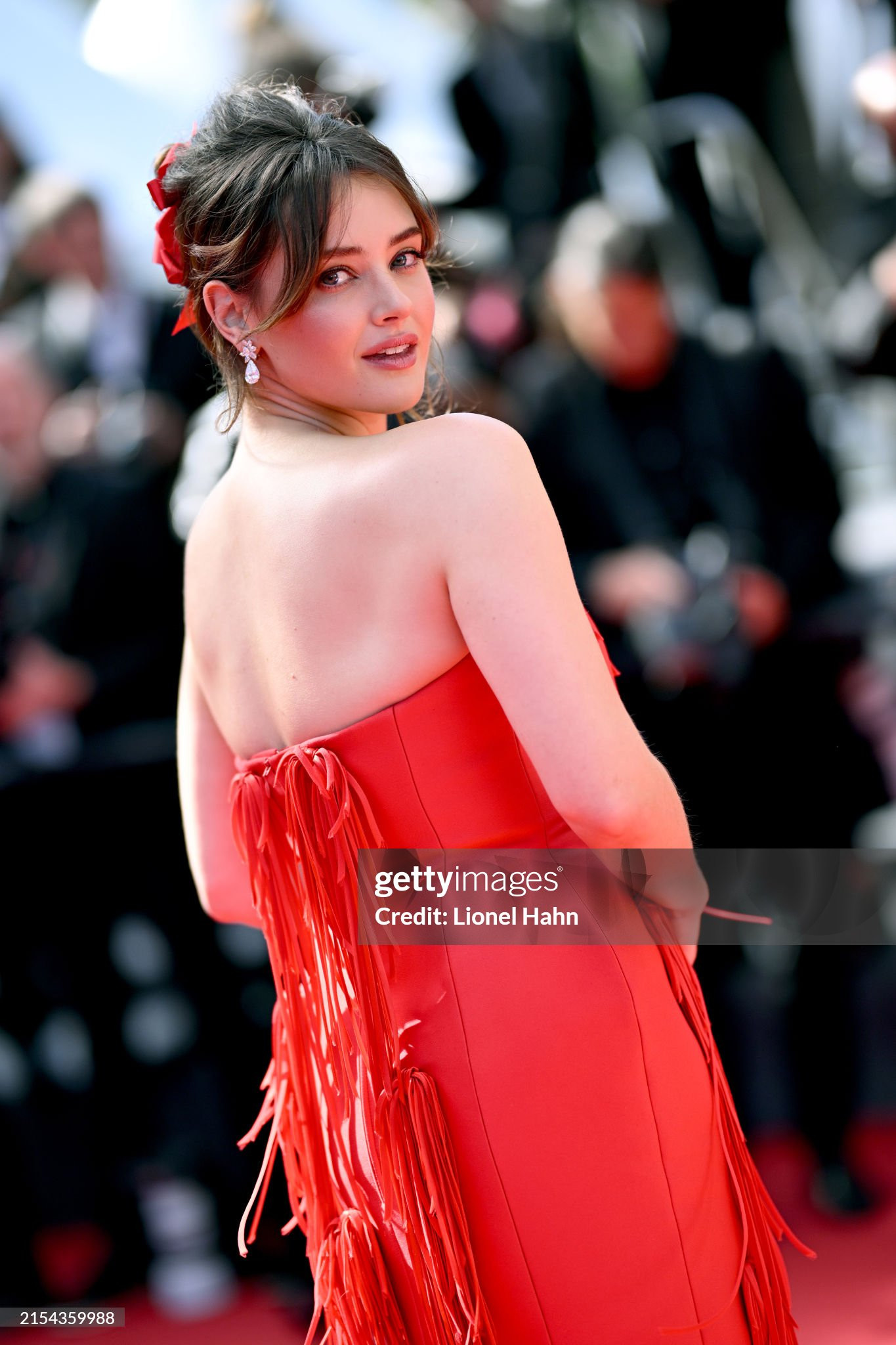 Katherine Langford duy trì phong độ nhan sắc trên thảm đỏ LHP Cannes ngày 10. Mỹ nhân series 13 Reasons Why nổi bật trong mẫu đầm cúp ngực tua rua màu đỏ là thiết kế tùy chỉnh của nhà mốt Prada.