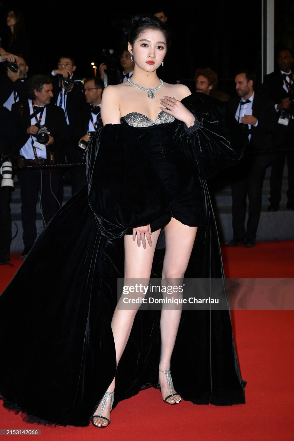 Quan Hiểu Đồng tiếp tục giữ phong độ với bộ váy nhung đen, khoe khéo đôi chân dài miên man và làn da trắng nổi bật.