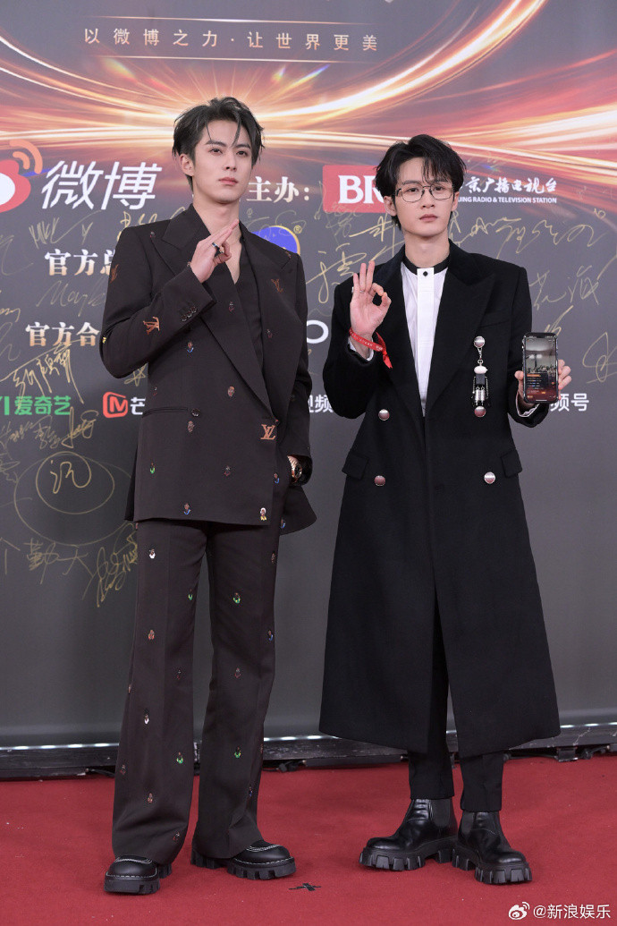 Mang gương mặt lạnh lùng, điển trai, Vương Hạc Đệ và Đàn Kiện Thứ không quên thể hiện khát vọng "tấu hề" mọi nơi, ngay cả trên thảm đỏ Đêm hội Weibo 2023. Hai người rủ nhau tạo dáng bên màn hình điện thoại đang mở livestream thảm đỏ, ý tưởng "không ai làm lại".