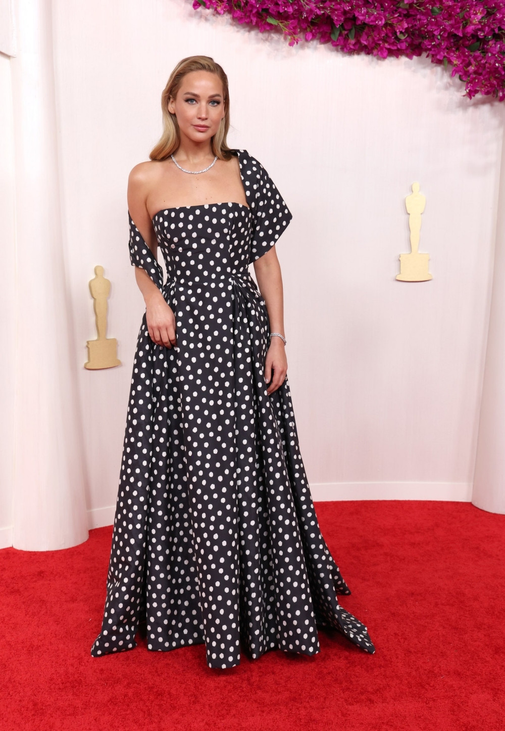 Jennifer Lawrence diện trang phục dòng haute couture của Dior, đeo trang sức Swarovski.