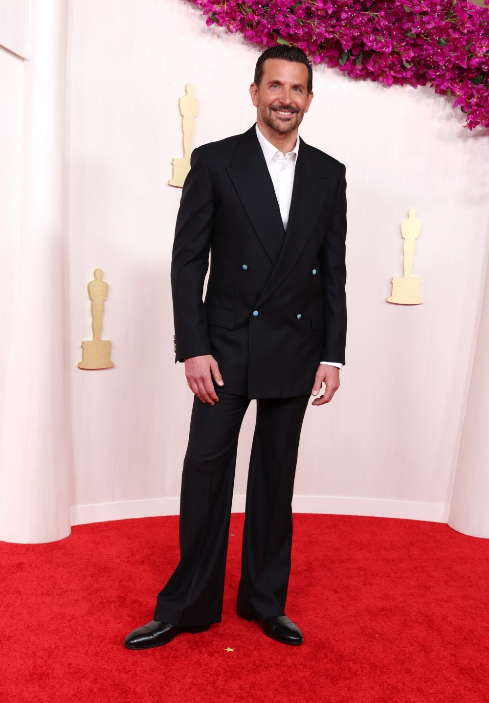 Tài tử Bradley Cooper chọn phong cách cổ điển với quần ống loe, set suit thuộc thương hiệu Louis Vuitton.