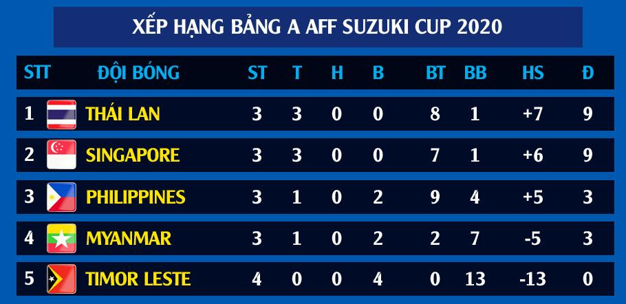 Chung cuộc, Singapore giành chiến thắng với tỷ số 2-0. Với kết quả này, thầy trò Tatsuma Yoshida đã nối gót Thái Lan vào bán kết AFF Cup 2020. Ở trận hạ màn vòng bảng vào ngày 18/12 tới, 2 đội sẽ gặp nhau trực tiếp để phân định ngôi đầu.
