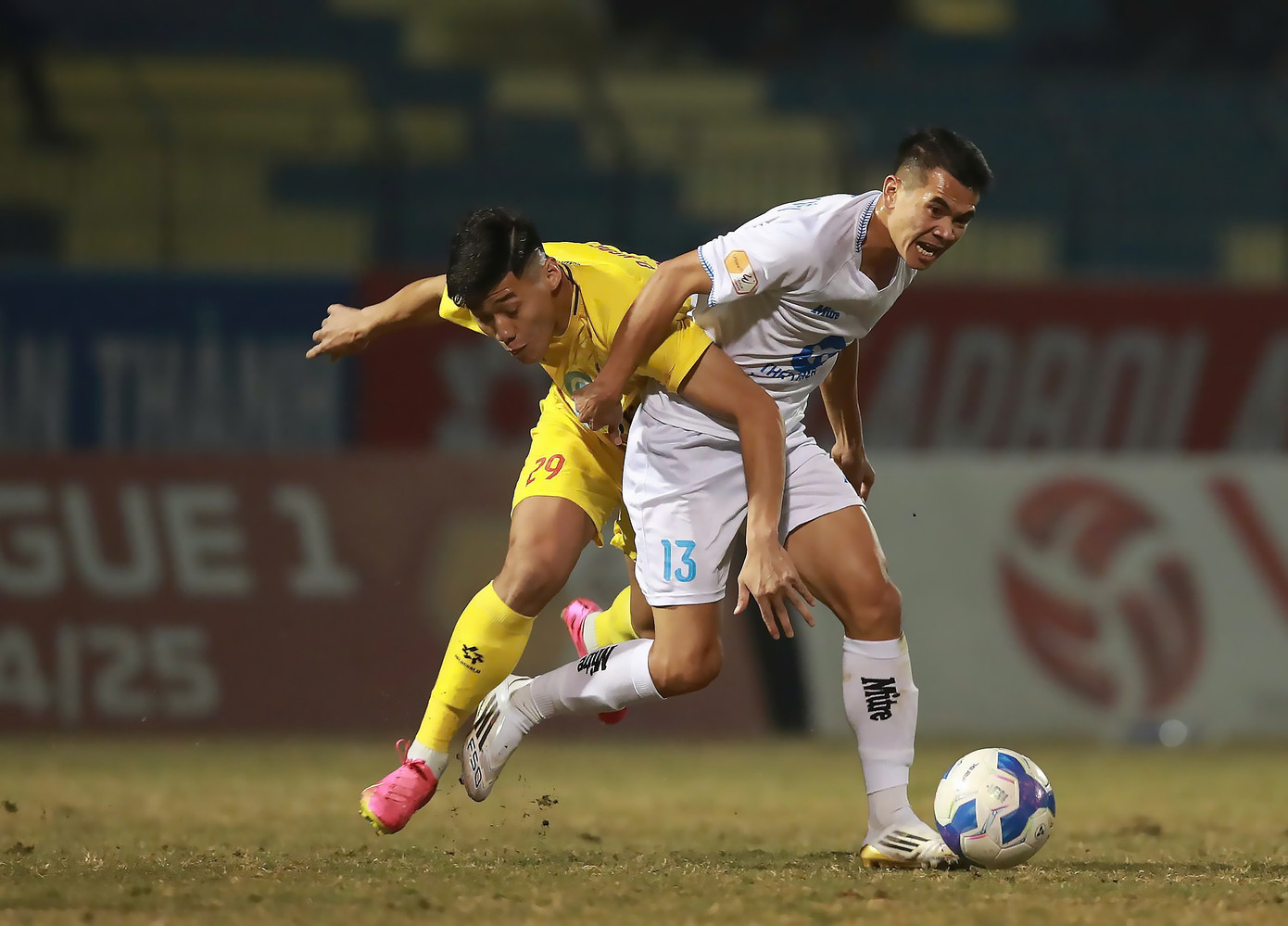 Phút 55: Văn Đạt của chủ nhà Nam Định phải nhận thẻ vàng vì pha vào bóng quyết liệt với Văn Thắng.