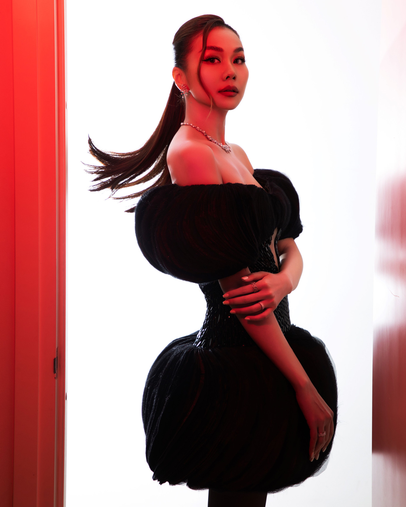 Mới đây, Thanh Hằng trở thành tâm điểm chú ý của truyền thông khi diện bộ váy hở vai, khoét ngực màu đen rất gợi cảm và khoe được đôi chân dài. Bộ trang phục do NTK Lê Thanh Hòa thực hiện, trích từ bộ sưu tập mới nhất của anh.