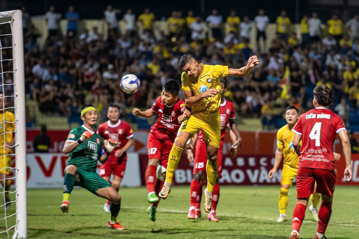 Phút 42: Thái Bình phạm lỗi với Hữu Sơn. Việt Hưng treo bóng vào khu cấm địa. Bóng sượt qua đầu Lucao đi vào góc xa khiến thủ môn Thanh Thắng vất vả cản phá.