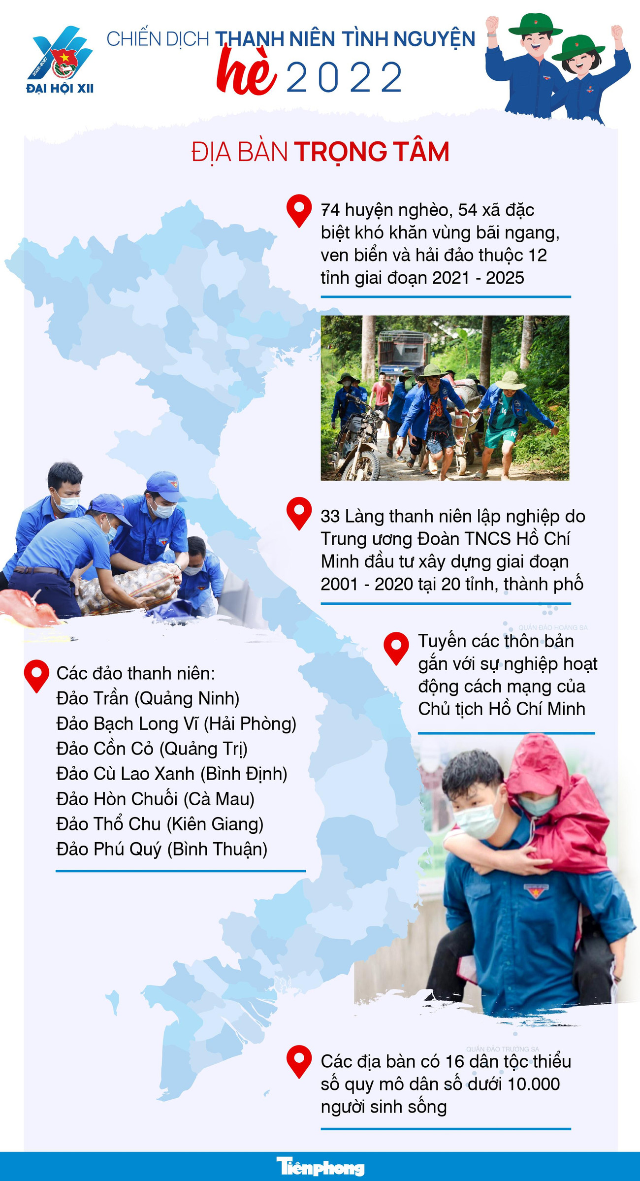 TPO - Chiến dịch Thanh niên tình nguyện hè 2022 sẽ hướng tới 74 huyện nghèo thuộc 26 tỉnh, 54 xã đặc biệt khó khăn vùng bãi ngang, ven biển và hải đảo thuộc 12 tỉnh giai đoạn 2021 – 2025; 33 làng thanh niên lập nghiệp; các đảo thanh niên; các địa bàn có 16 dân tộc thiểu số quy mô dân số dưới 10.000 người sinh sống…