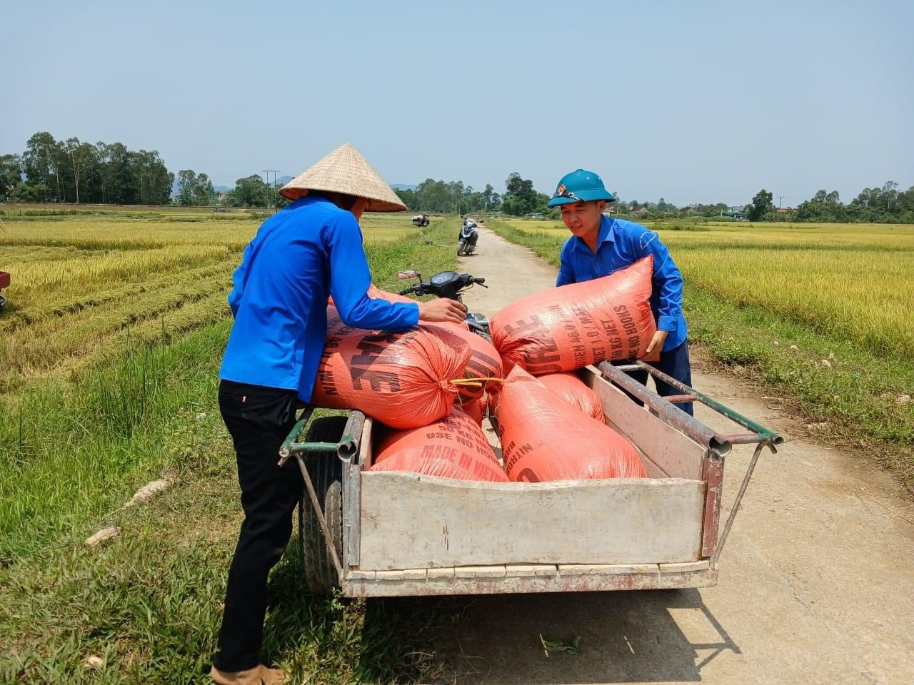 | Thanh niên vận chuyển lúa từ ruộng lên đường để chở về nhà. |