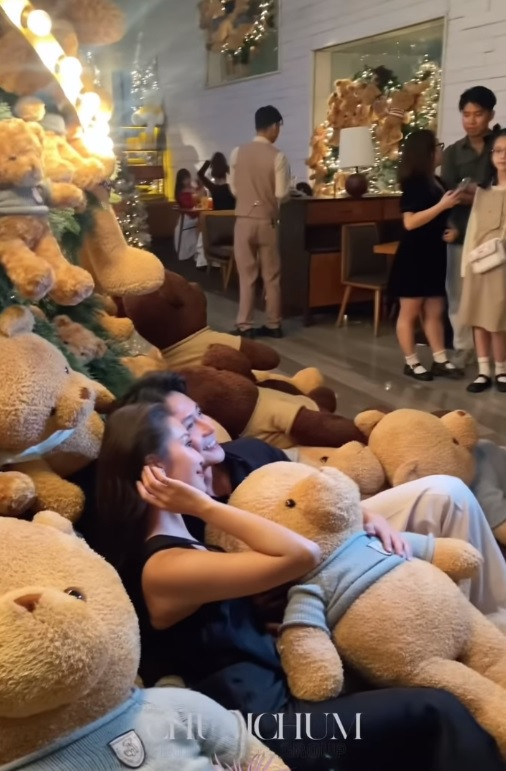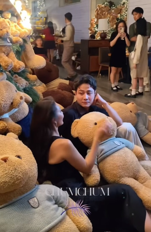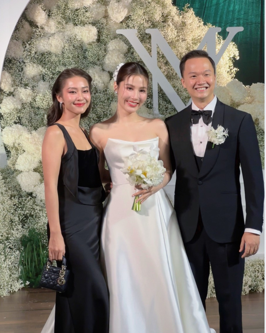 Đã vậy, hai người còn như hình với bóng trong suốt buổi tiệc. Đến cuối hôn lễ, Khả Ngân cùng Thanh Sơn còn chụp ảnh chung cực tình cảm như thế này. Có thể thấy Thanh Sơn chưa quen biết nhiều lắm với các đồng nghiệp phía Nam nên trò chuyện với Khả Ngân là chủ yếu. (Nguồn: TikTok @Chum Chum).