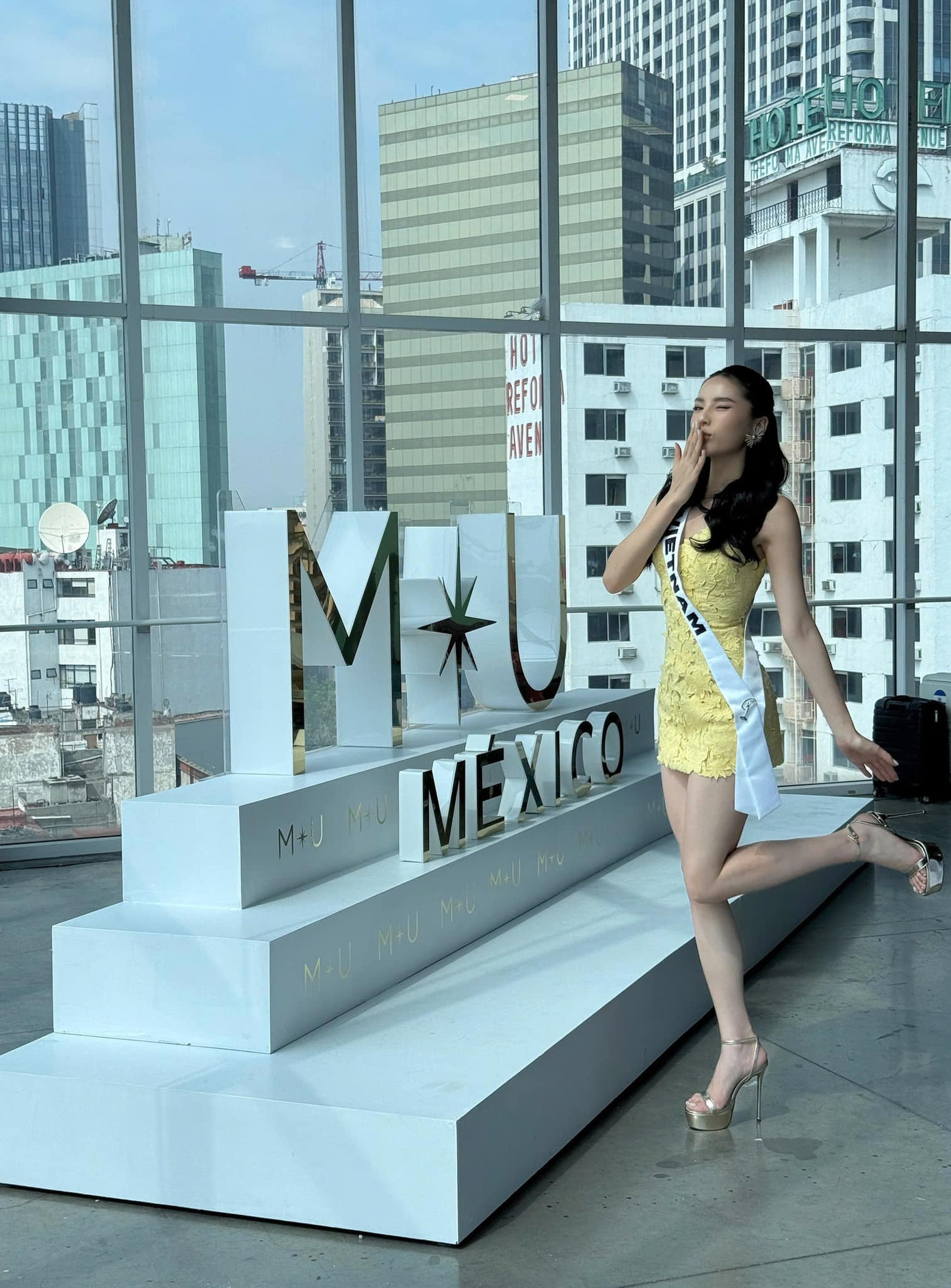 Kỳ Duyên mặc bộ váy ôm sát màu vàng tươi, chất liệu ren kết hợp với mái tóc uốn xoăn nhẹ, mang lại vẻ dịu dàng nữ tính cho nàng hậu. Cô còn không quên tạo dáng nhí nhảnh trước biểu tượng của Miss Universe.