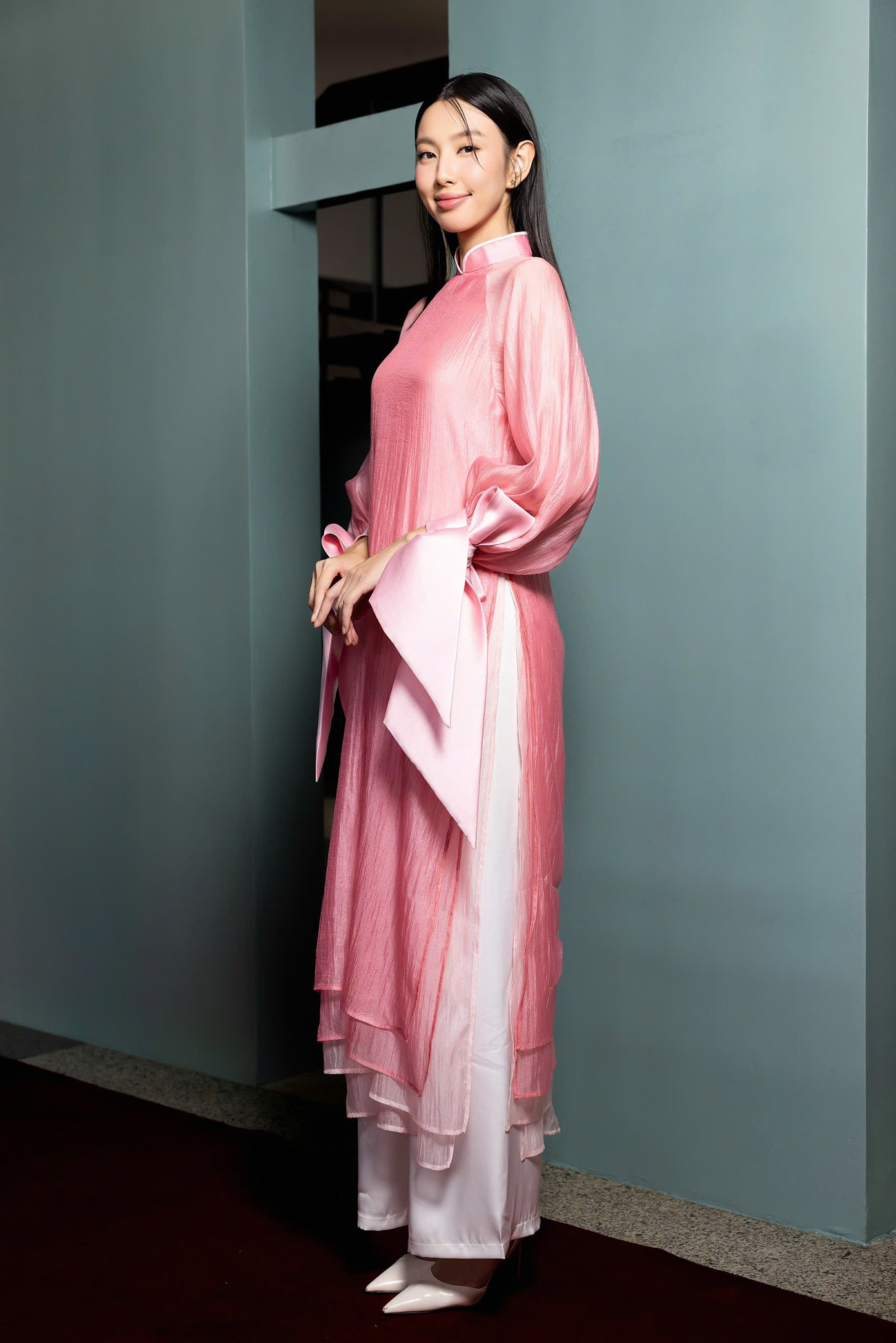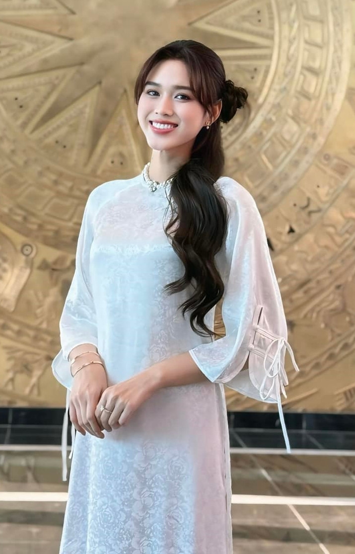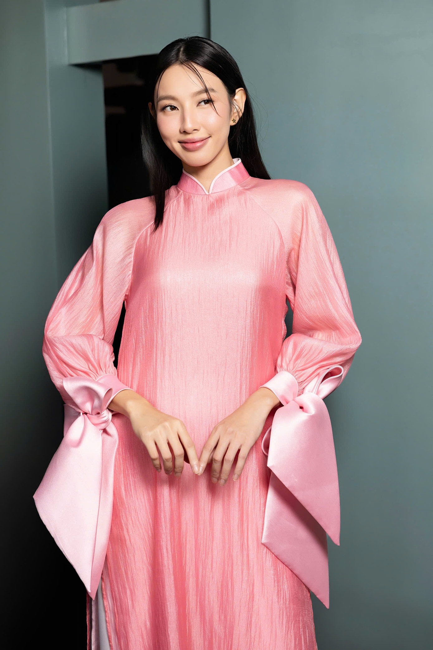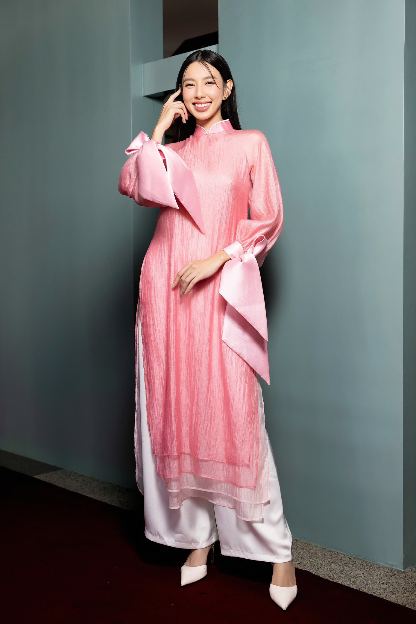 Hoa hậu Đỗ Thị Hà cũng chọn áo dài đính nơ ở phần tay. Tuy không to bản như thiết kế Thùy Tiên mặc thì những chiếc nơ này cũng giúp bộ áo dài nhìn điệu đà, ngọt ngào hơn.