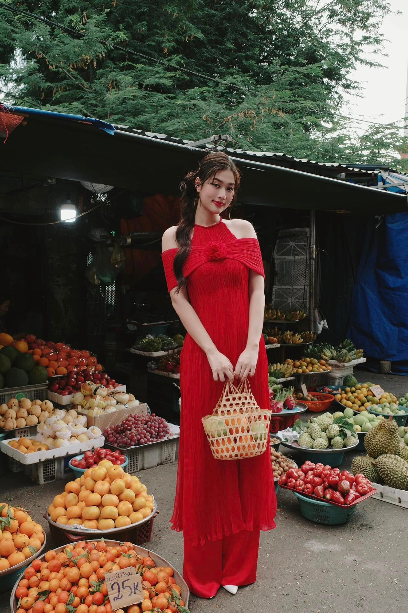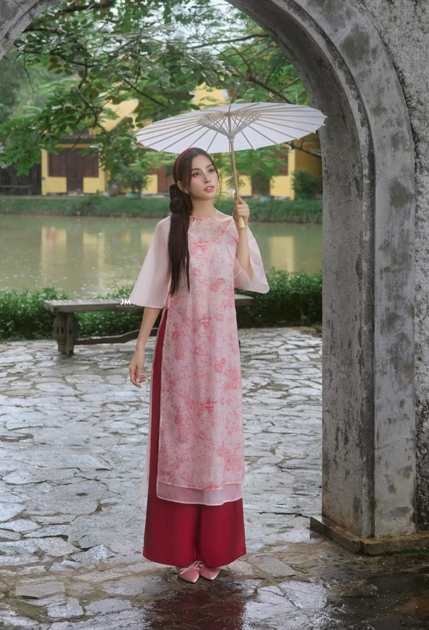 Hoa hậu Tiểu Vy lại kết hợp quần đỏ sẫm với áo dài màu hồng nhạt in hoa dịu dàng. Có thể thấy các nàng hậu vẫn rất yêu thích áo dài dáng suông, không hề kén dáng và rất thoải mái cho người mặc.