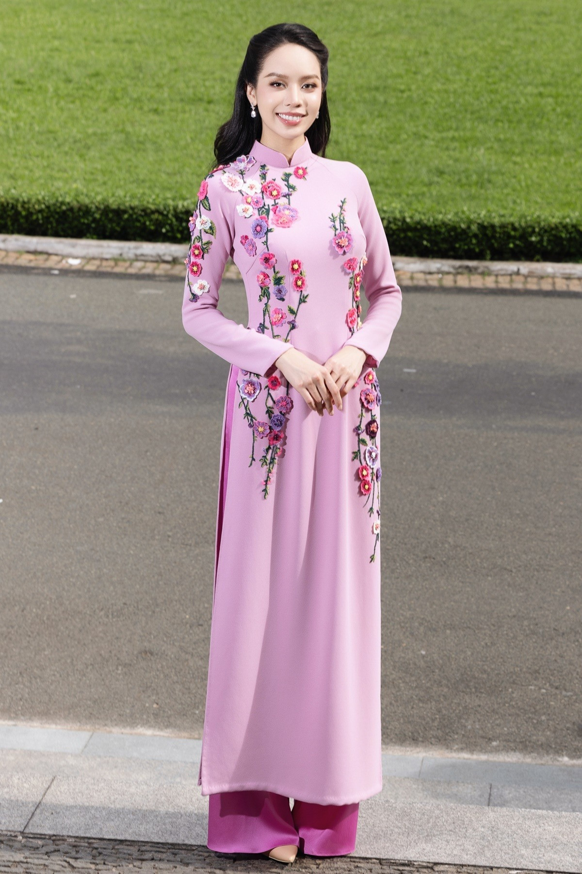 Hoa hậu Thanh Thủy lại ưu ái cho áo dài thêu hoa dù xu hướng năm nay nghiêng về áo dài đơn sắc nhiều hơn. Miss International 2024 rạng rỡ với nhiều thiết kế có màu sắc khác nhau với hoa văn rất đa dạng.