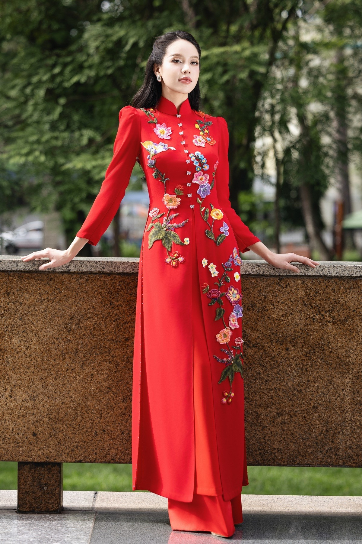 Cũng là một thiết kế nhấn mạnh vào phần tay áo nhưng bộ áo dài mà Hoa hậu Thiên Ân mặc lại rất độc đáo. Ống tay áo được biến tấu thành chiếc nơ to bản rất ấn tượng. Màu đỏ rực rỡ của trang phục càng hợp với không khí ngày Tết, nhìn đã thấy rộn ràng.