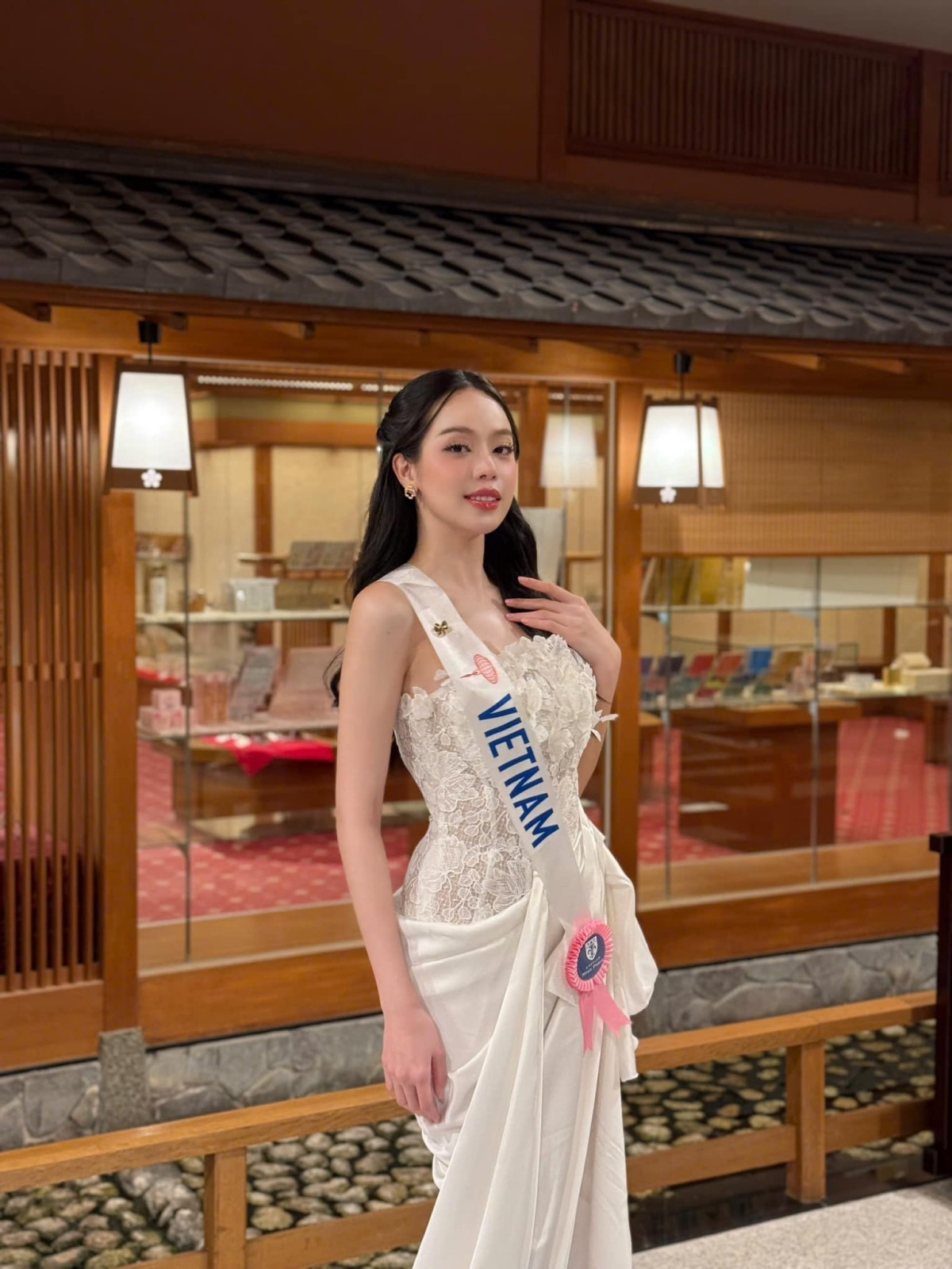Ngày thứ 2 tại Nhật Bản, Hoa hậu Thanh Thủy ghi điểm tuyệt đối với set đồ ren phối voan trắng hồng. So với loạt ảnh studio được công bố trước đó, người đẹp thay đổi kiểu tóc gọn gàng hơn.