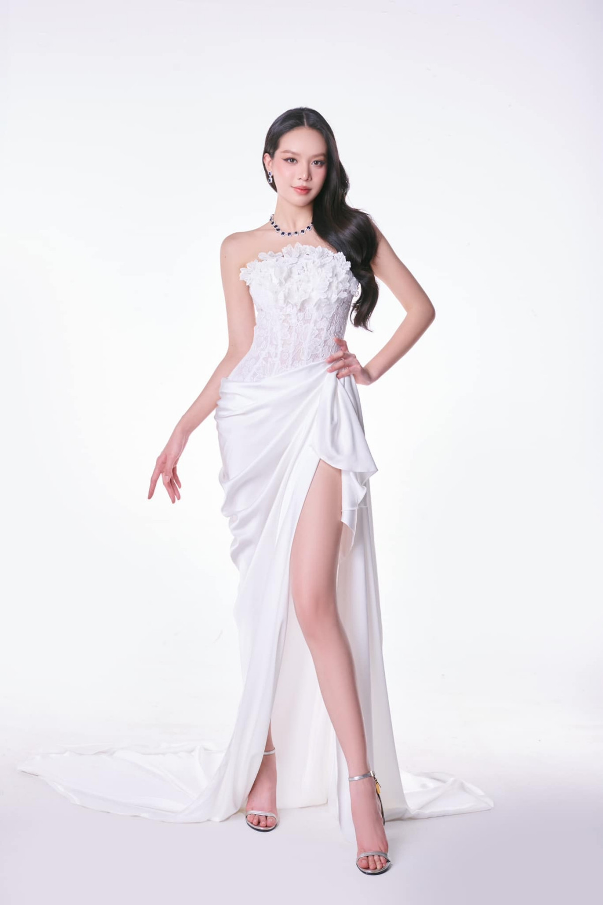 Màu trắng là gam màu trung tính và nổi bật, tuy nhiên cũng là màu sắc kén da và kén dáng người mặc. Hoa hậu Thanh Thủy chứng minh nhan sắc ngọt ngào cực hợp với tông màu này, giúp cô khoe tối đa lợi thế hình thể khi tham gia Miss International 2024.