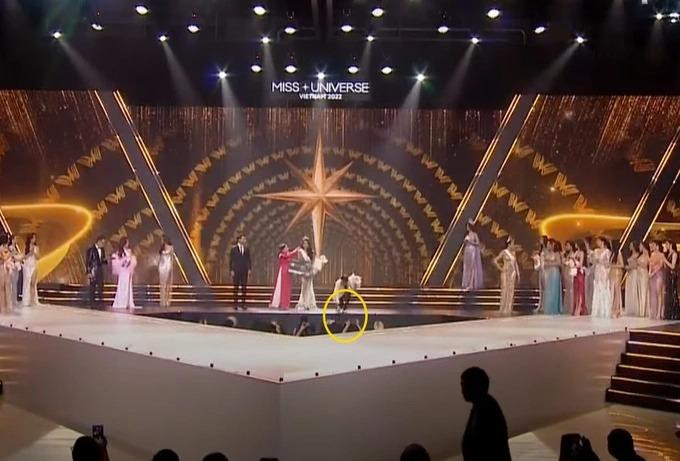 Thảo Nhi Lê cũng trải qua giây phút giật mình vì vương miện rơi xuống đất, nhưng cô đã lấy lại bình tĩnh rất nhanh để mỉm cười chờ ban tổ chức giúp đỡ.