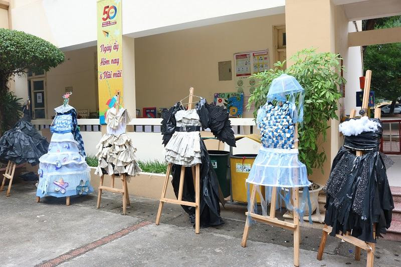 | Trang phục được tái chế từ giấy báo, túi nilon... của teen THCS Đống Đa cũng được trưng bày. |