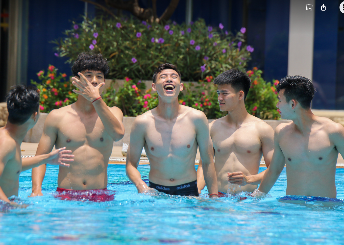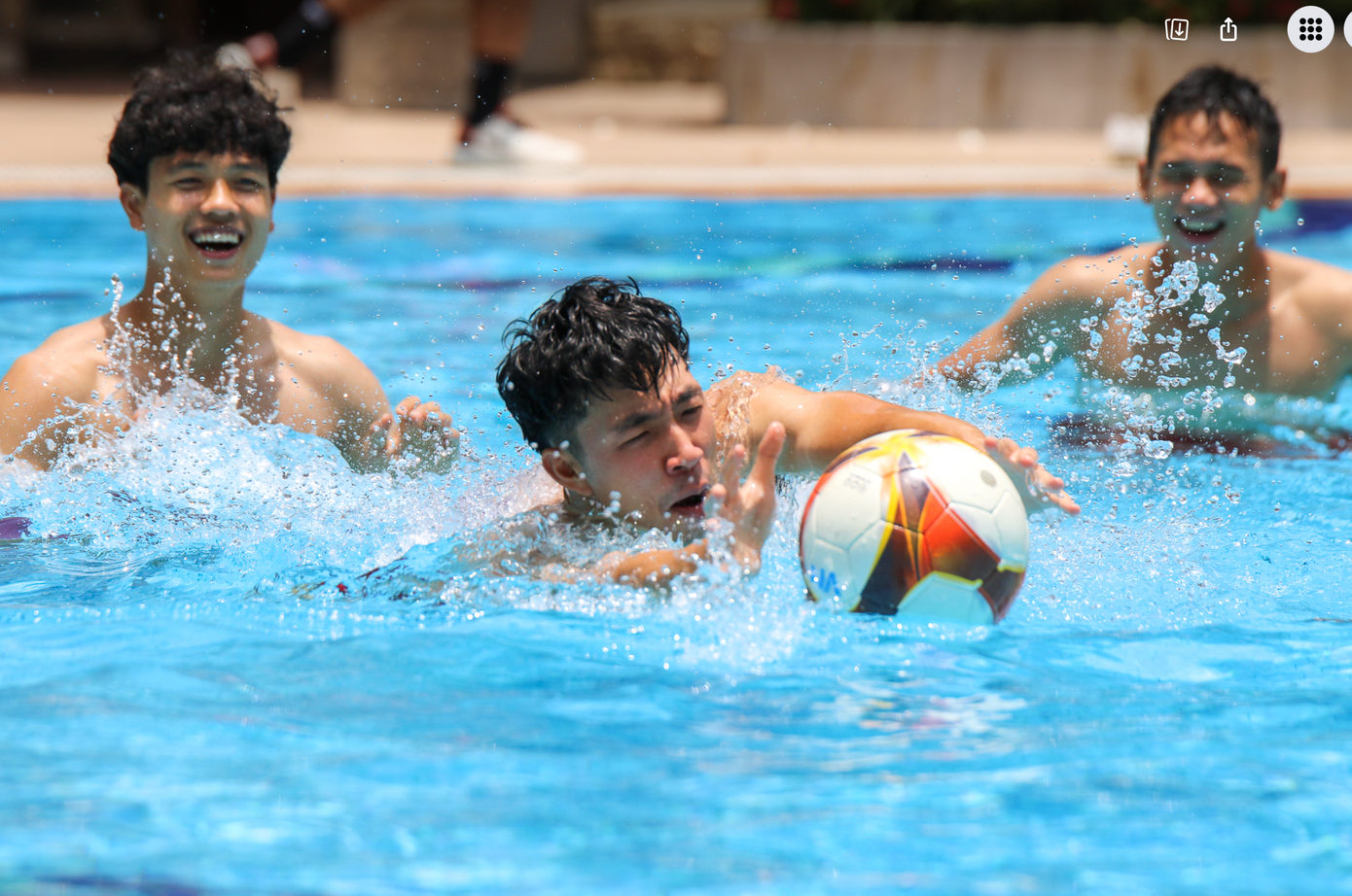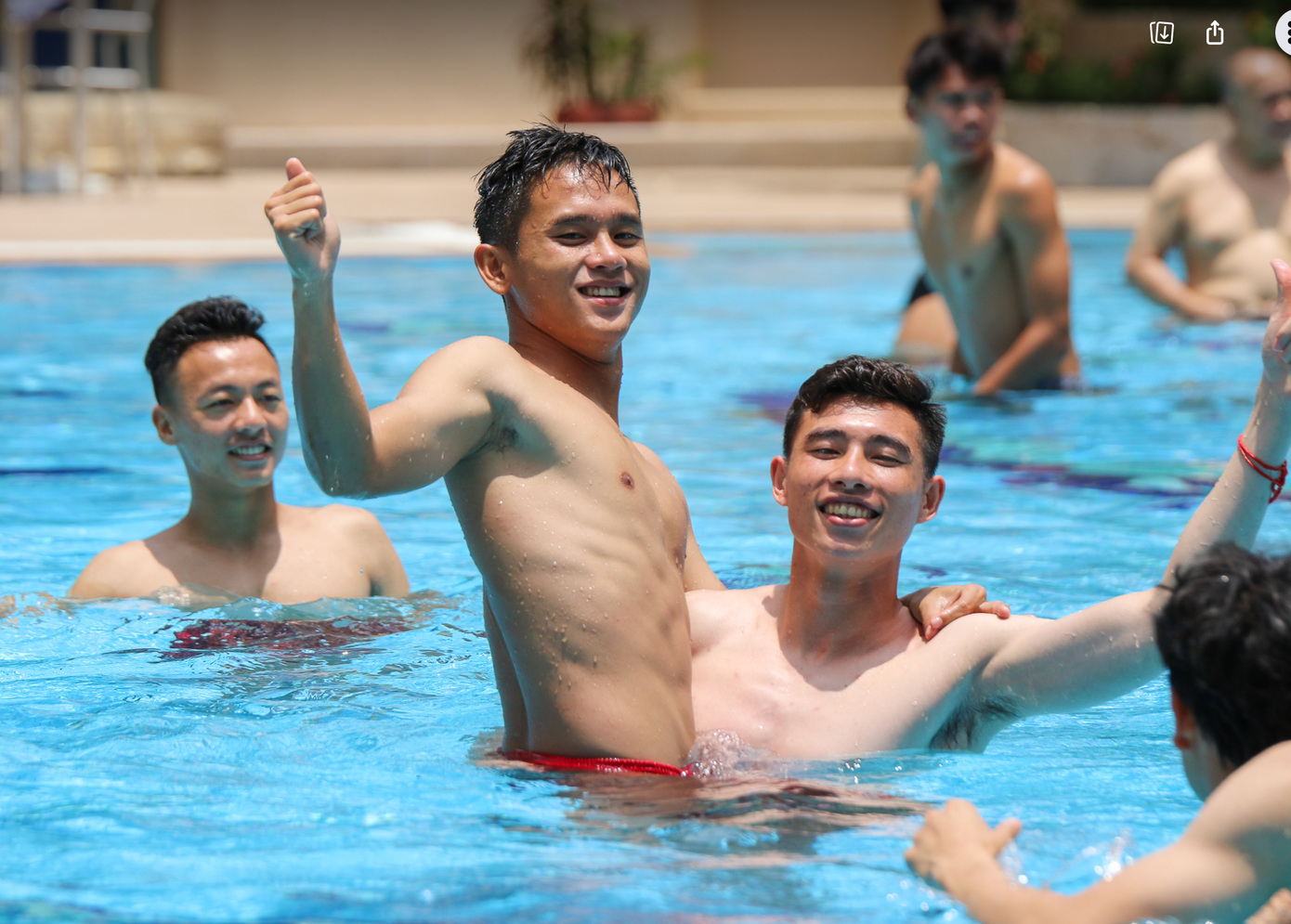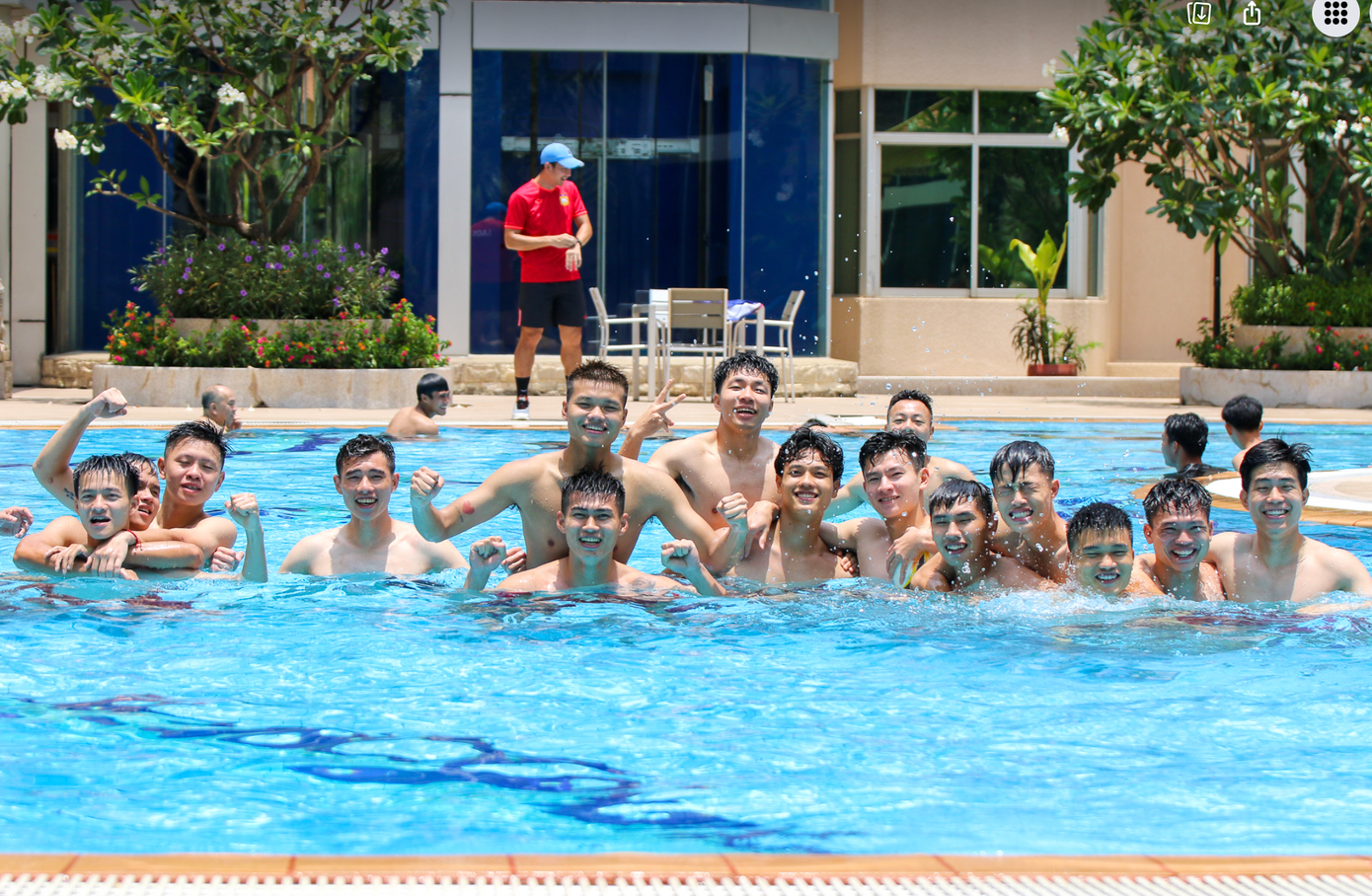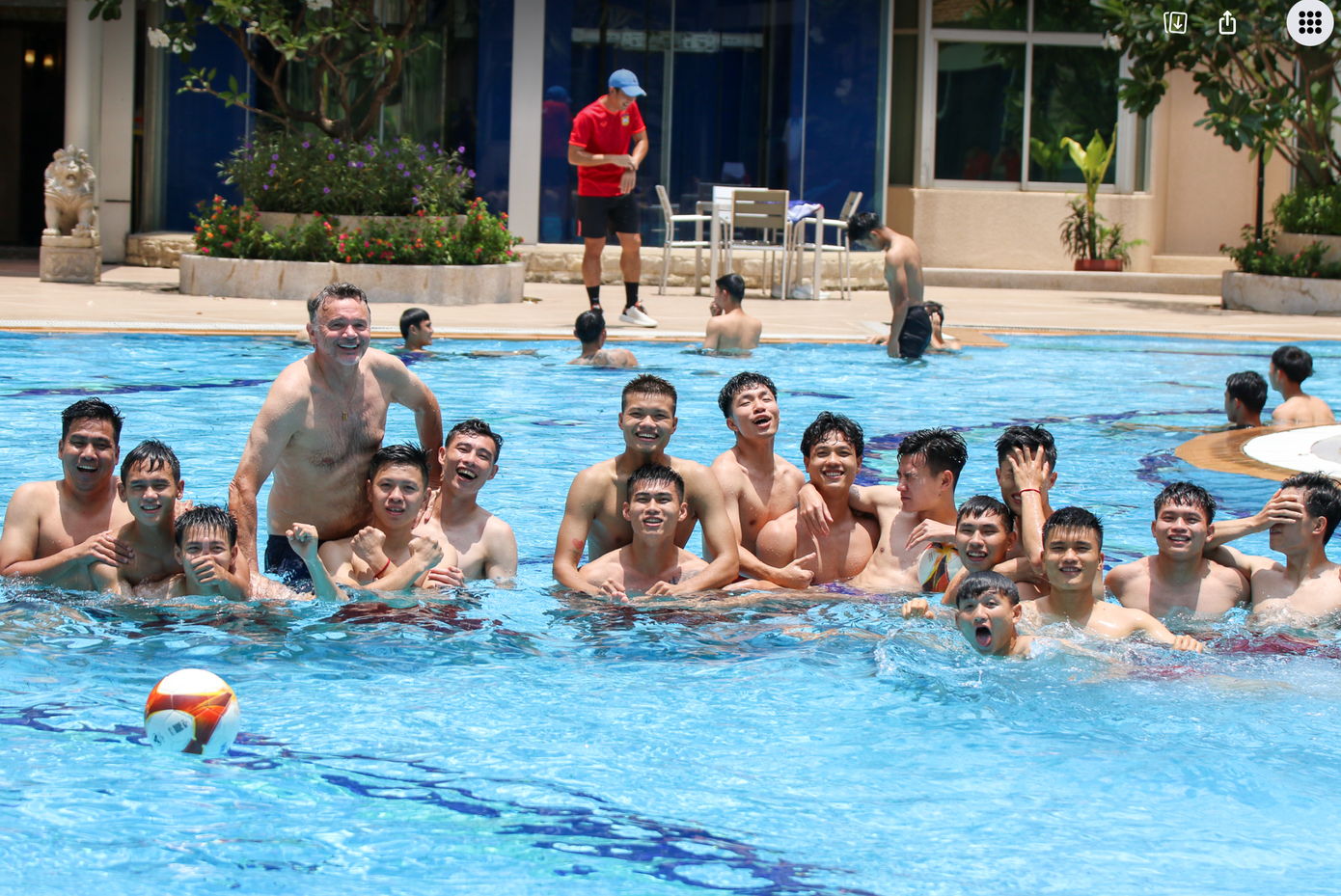Thời tiết tại Phnom Penh những ngày này rất nắng nóng. Chính vì vậy sau trận đấu căng thẳng, các cầu thủ U22 Việt Nam tỏ ra rất sảng khoái khi được bơi, ngâm người trong làn nước mát lạnh. HLV Troussier cũng tham gia rất nhiệt tình với các học trò.