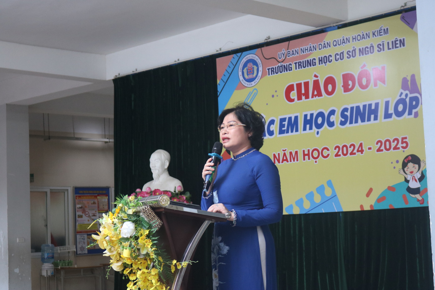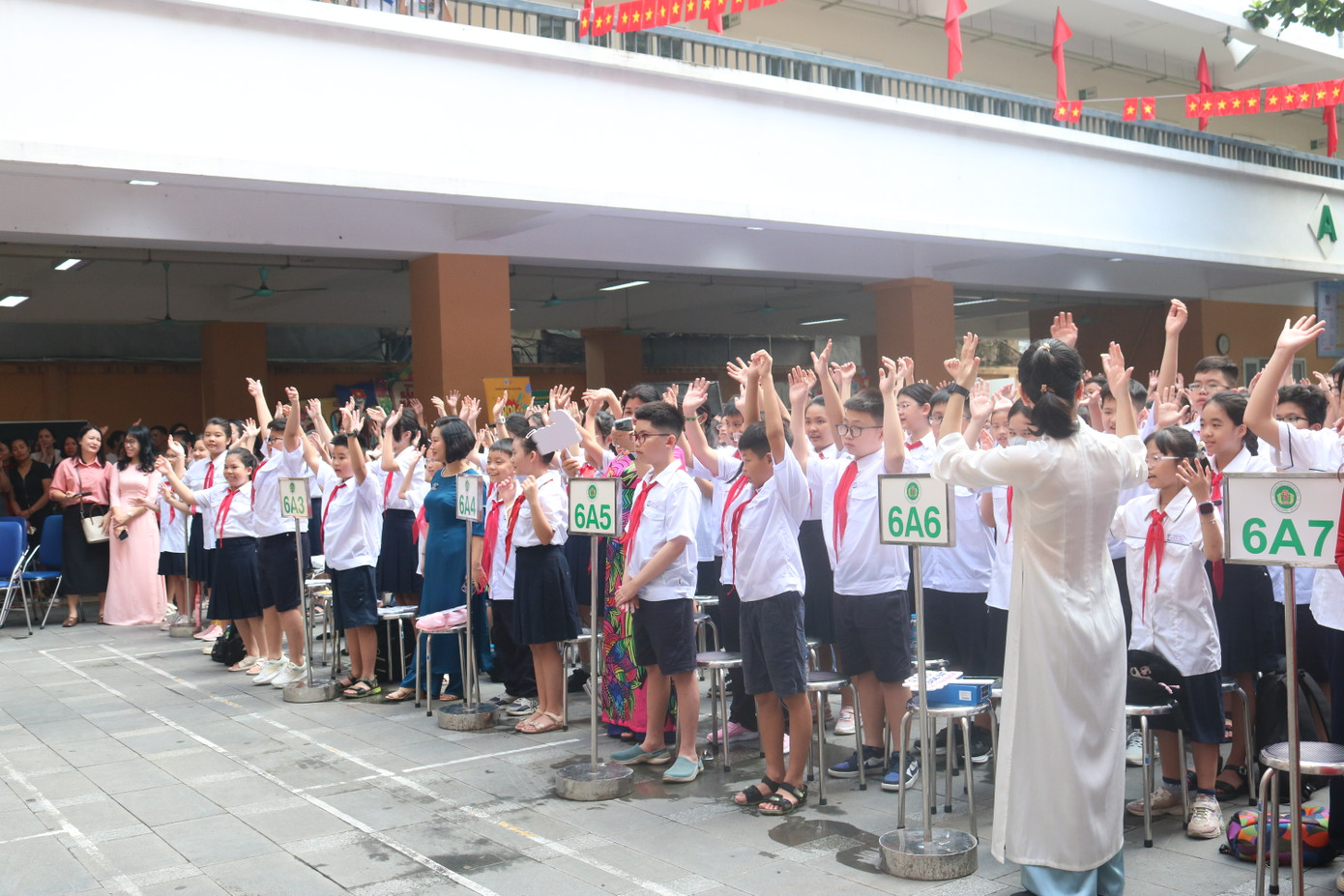 Sau phần giao lưu, cô Hiệu trưởng Phạm Thu Hà lên phát biểu dặn dò các "út ít" của trường. Cùng với lời chúc mừng, cô cũng gửi gắm thế hệ học sinh mới sẽ cố gắng tiếp nối những thành tích học tập, rèn luyện mà trường đã và đang đạt được.