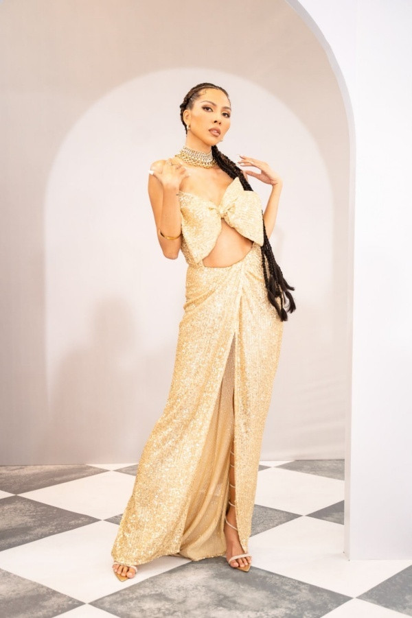 | Thiết kế váy xẻ cao cùng layout trang điểm sắc sảo giúp Anh Thư luôn nổi bật. |