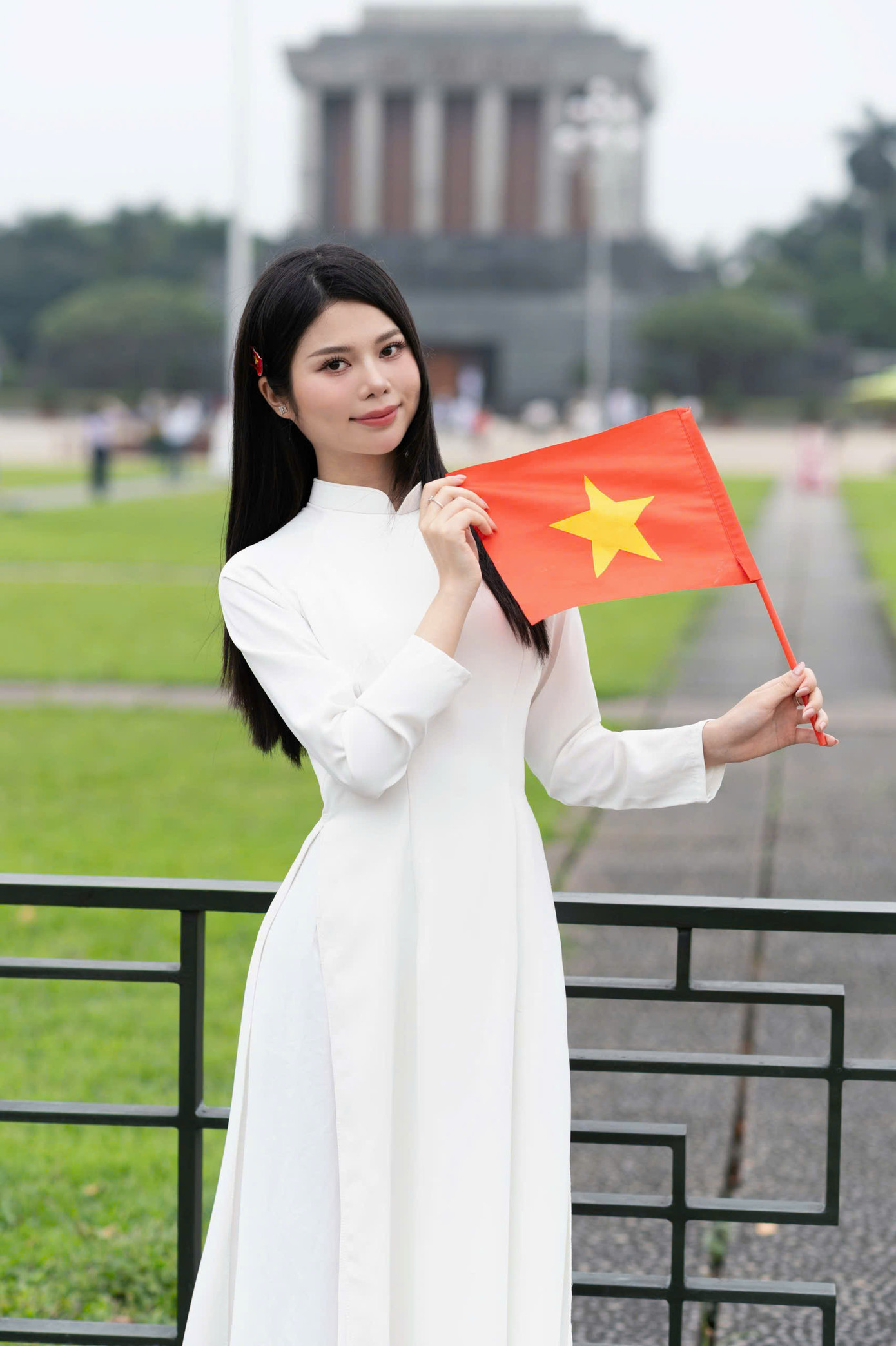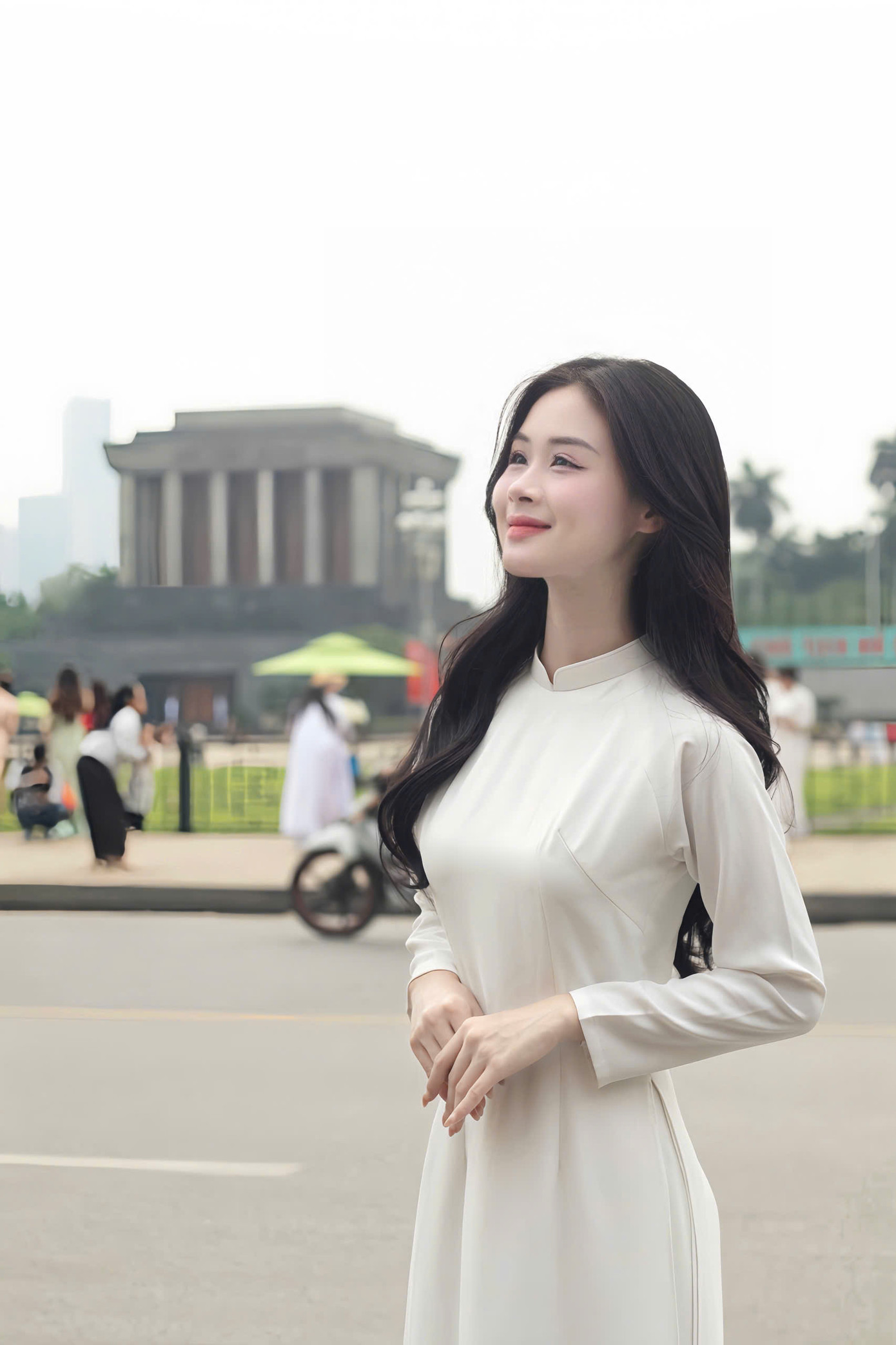 | Hoàng Ngân xinh xắn trong tà áo dài bên lăng Bác, hướng về ngày Giải phóng miền Nam, thống nhất đất nước. |