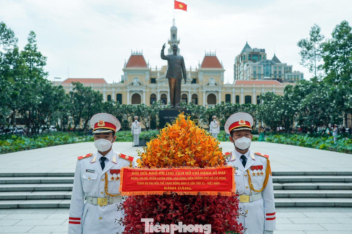 | Trong chương trình, chiều 3/6, đoàn HLV, VĐV TPHCM đã báo công, dâng hoa tại tượng đài Chủ tịch Hồ Chí Minh (đường Nguyễn Huệ, Quận 1). Ảnh: Phạm Nguyễn |