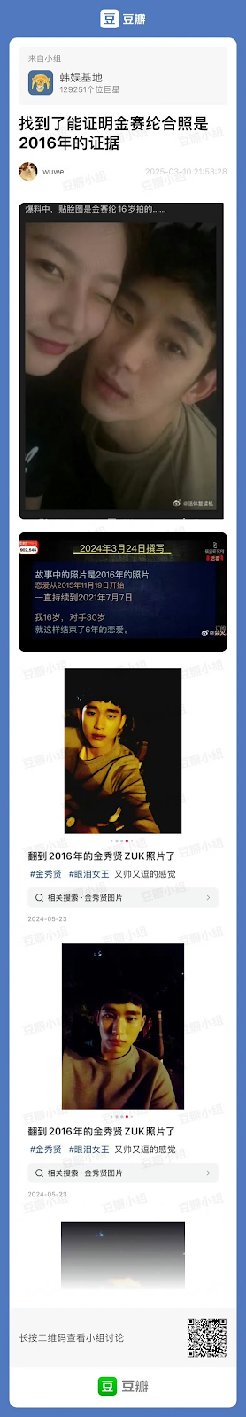 Chiều 11/3, Viện Garo Sero tung ra bức ảnh Kim Soo Hyun và Kim Sae Ron thơm má. Màu áo của anh và họa tiết trên áo của cô giống bức ảnh kề má Sae Ron từng đăng Story Instagram vào tháng 3/2024. Phía Garo Sero cho biết hình được chụp từ năm 2016, khi cả hai hẹn hò được 1 năm.