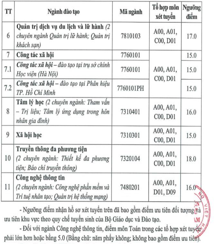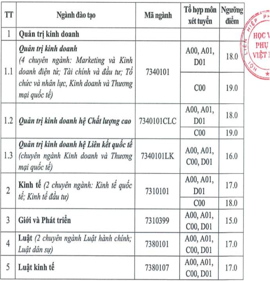 Học viện Phụ nữ Việt Nam thông báo ngưỡng điểm nhận hồ sơ xét tuyển (điểm sàn) theo kết quả thi Tốt nghiệp THPT năm 2022 (xét tuyển theo tổ hợp) hệ đại học chính quy năm 2022.