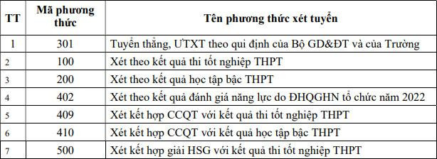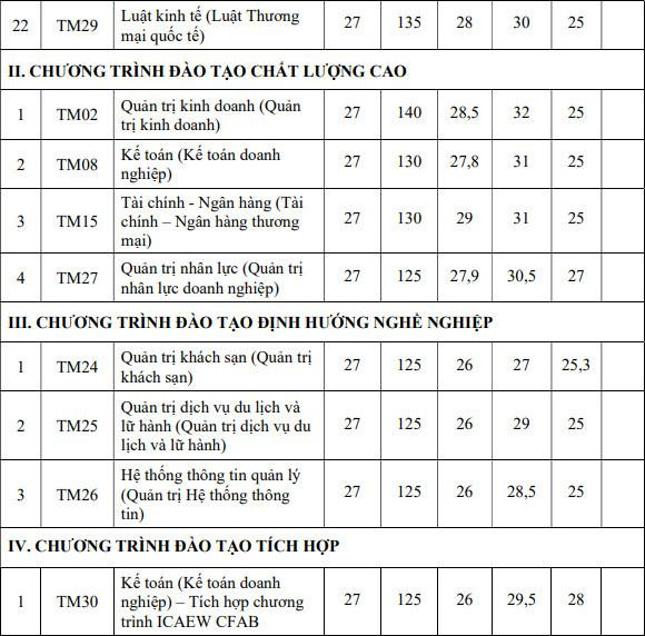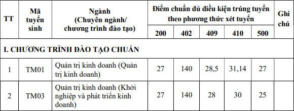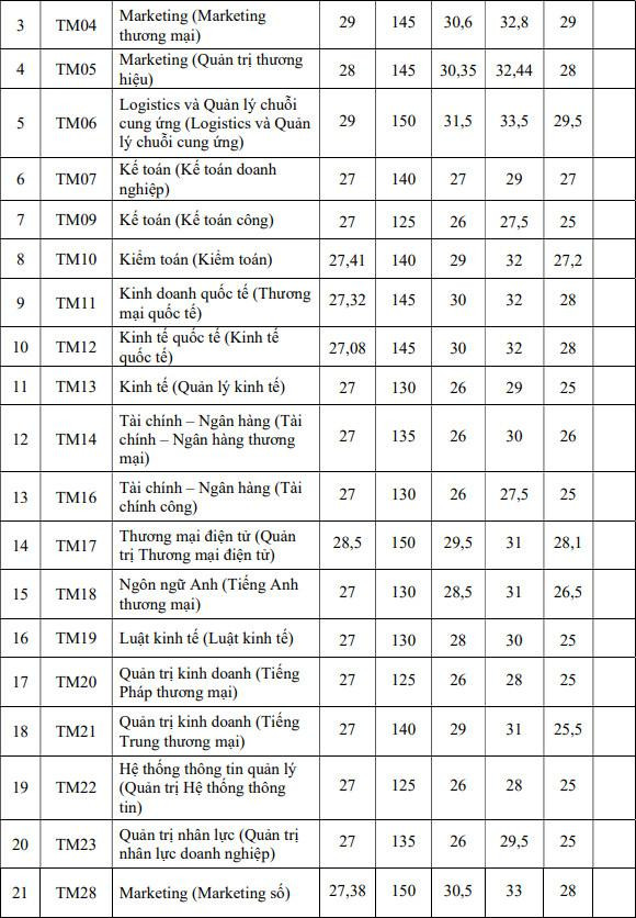 Hội đồng tuyển sinh Trường Đại học Thương mại thông báo điểm chuẩn đủ điều kiện trúng tuyển đại học chính quy năm 2022 theo các phương thức xét tuyển 200, 402, 409, 410, 500 như sau: