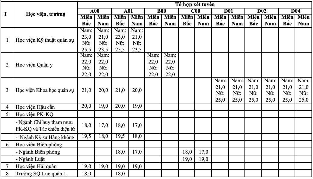 | Mức điểm cụ thể vào từng trường quân đội. |