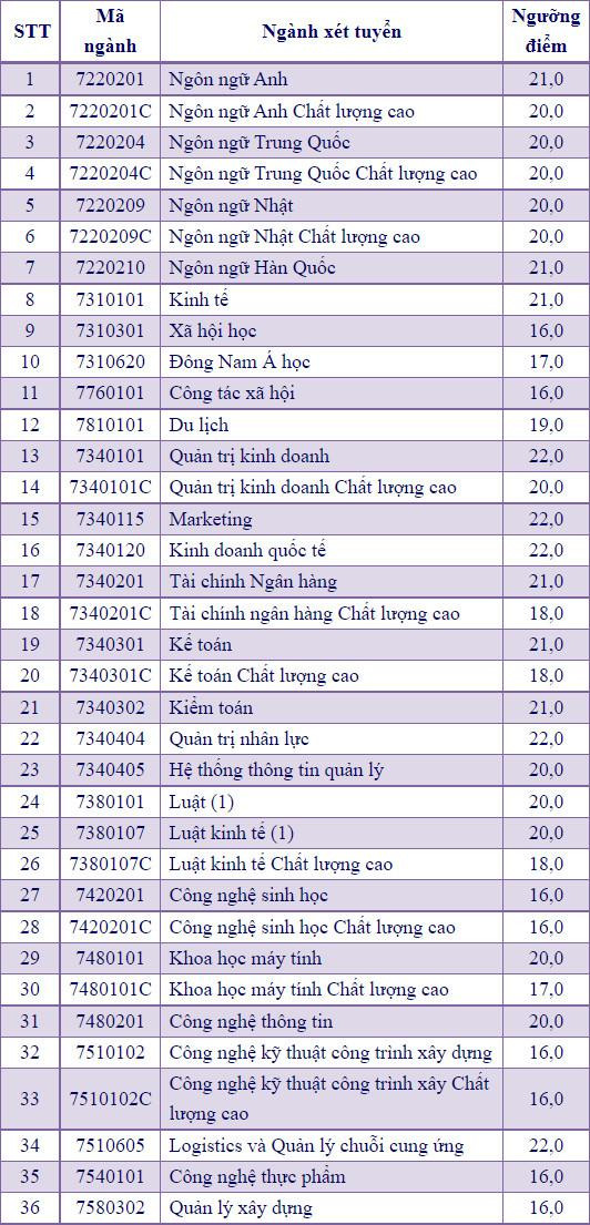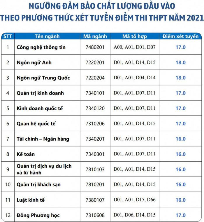 - Mức điểm tối thiểu là 16,00 điểm các ngành/ chuyên ngành: Ngành Quản trị kinh doanh, Ngành Kinh doanh quốc tế, Ngành Marketing, Ngành Tài chính - Ngân hàng, Ngành Kế toán, Ngành Ngôn ngữ Anh, Ngành Thương mại điện tử, Ngành Quản trị dịch vụ du lịch và lữ hành, Ngành Luật kinh tế, Ngành Kinh doanh nông nghiệp.