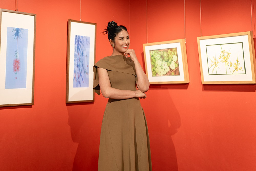 Hoa hậu Ngọc Hân khoe rằng có những loài thực vật quen thuộc mỗi ngày nhưng qua nét vẽ của các nghệ sĩ trẻ trong triển lãm này, chúng trở nên thật thơ mộng và mang tính nghệ thuật cao.