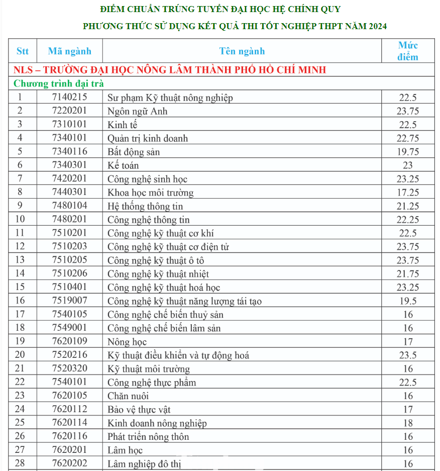 Tại Trường ĐH Nông Lâm TPHCM, điểm chuẩn các ngành dao động từ 15 đến 25 điểm. Mức điểm này tương tự năm 2023.