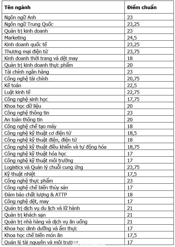 Các ngành học năm nay đa số đều giữ số điểm chuẩn tương tự như năm 2023, một số ngành học giảm nhẹ điểm chuẩn so với năm trước. Mức điểm chuẩn cao nhất năm 2023 của nhà trường là 25.25 điểm (ngành Logistics và quản lý chuỗi cung ứng).
