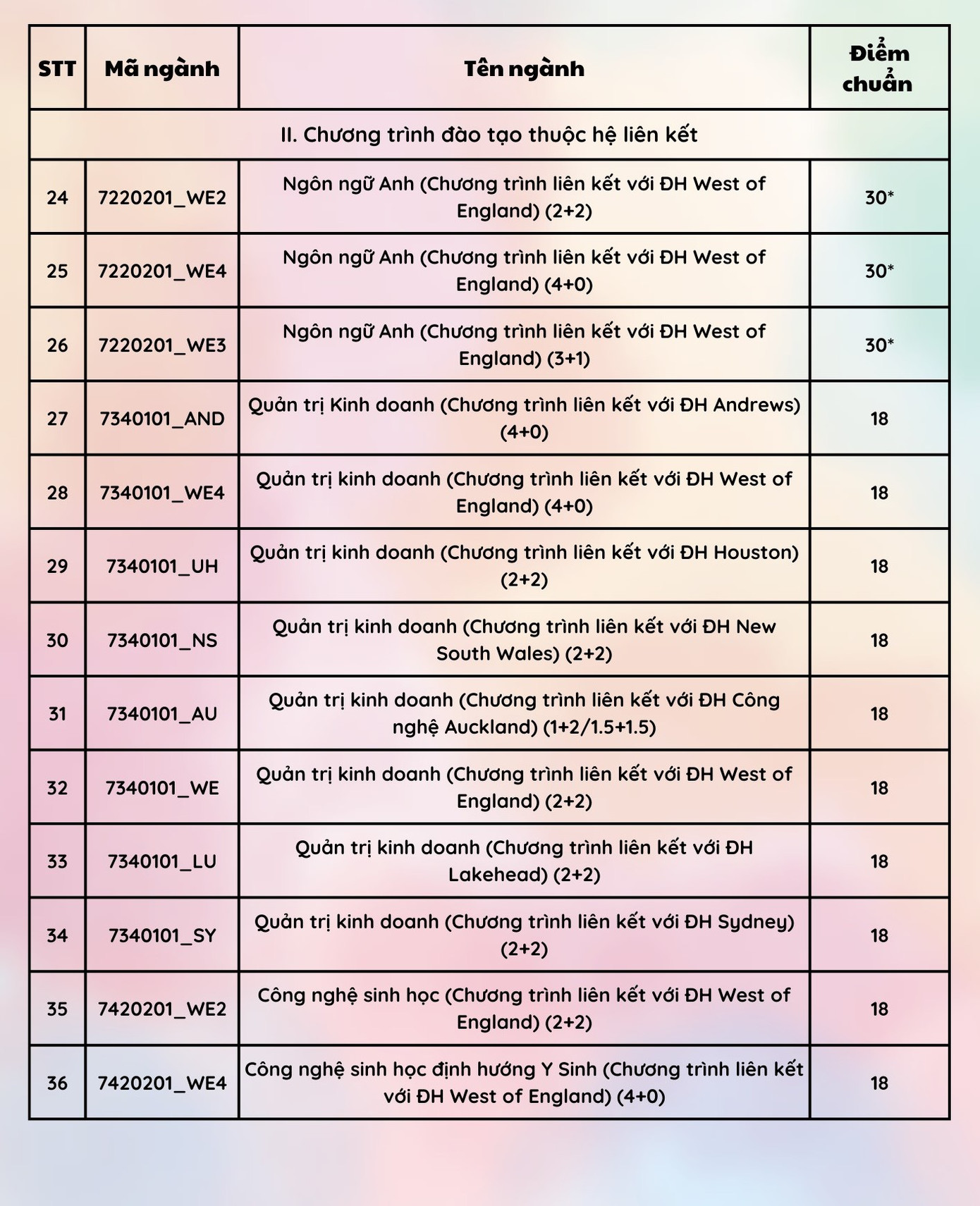 Riêng ngành Ngôn ngữ Anh, điểm bài thi tiếng Anh được nhân hệ số 2, sau đó quy tổng điểm thi của 3 môn thi/bài thi trong tổ hợp xét tuyển về thang điểm 30 trước khi xét trúng tuyển bằng cách lấy tổng điểm thi của 3 môn thi/bài thi trong tổ hợp xét tuyển của thí sinh nhân với 3, rồi chia cho 4.