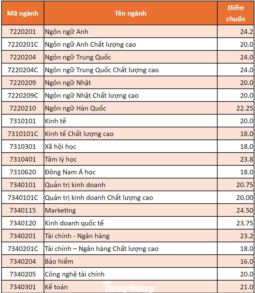 Cụ thể, tại Trường ĐH Mở TPHCM điểm chuẩn dao động từ 16 - 24,75. Mức điểm chuẩn có tăng ở một số ngành. Cụ thể: