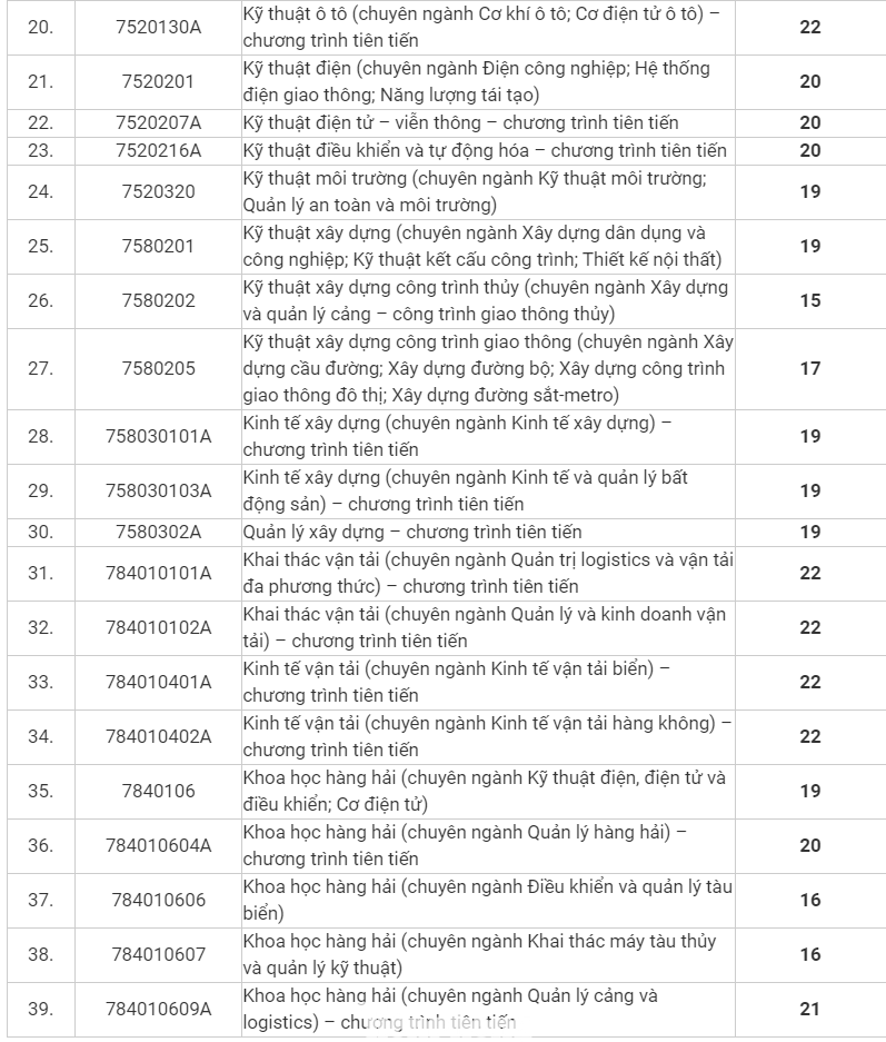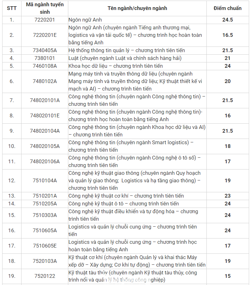 Tại Trường ĐH Giao thông Vận tải TPHCM, điểm chuẩn dao động từ 15 - 24,5 điểm. Điểm chuẩn các ngành cụ thể như sau: