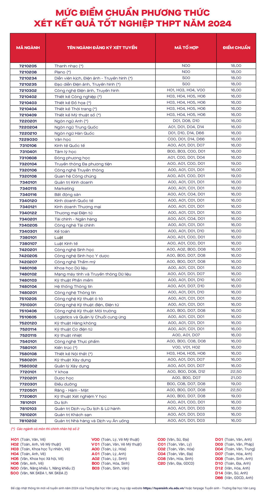 Trường ĐH Văn Lang vừa công bố mức điểm chuẩn trúng tuyển theo phương thức xét kết quả thi tốt nghiệp THPT năm 2024, cho 59 ngành đào tạo bậc Đại học hệ chính quy của trường. Hai ngành có điểm chuẩn cao nhất tại Trường ĐH Văn Lang là Y khoa và Răng-Hàm-Mặt: 22,5 điểm, kế đến là ngành Dược học: 21 điểm.