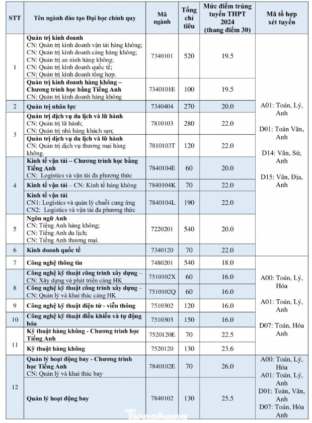 Tại Học viện Hàng không Việt Nam, điểm chuẩn dao động từ 16 – 26 điểm. Ngành có điểm chuẩn 26 điểm là Quản lý hoạt động bay – chương trình Tiếng Anh. Điểm chuẩn các ngành như sau: